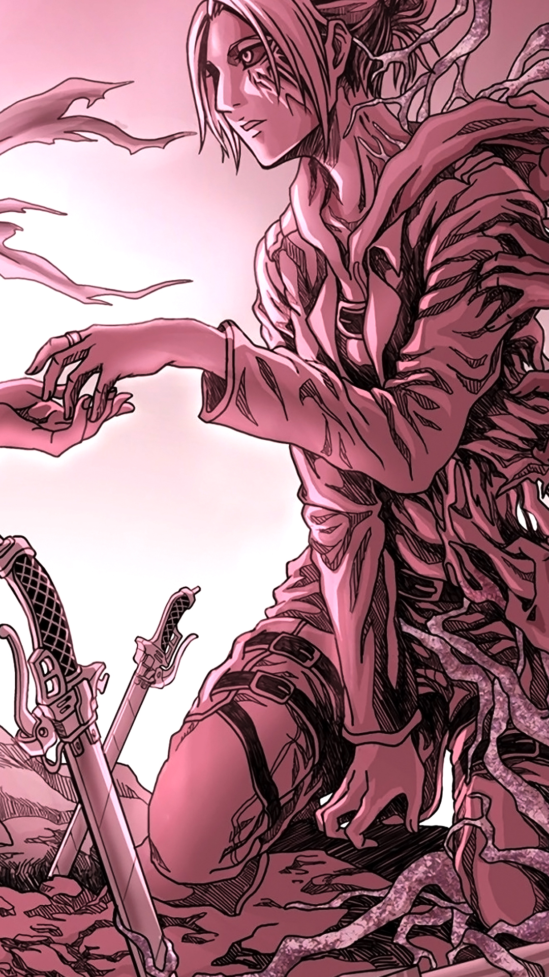 Mikasas Gesicht ist eingefallen und ihre blauen Augen brennen.