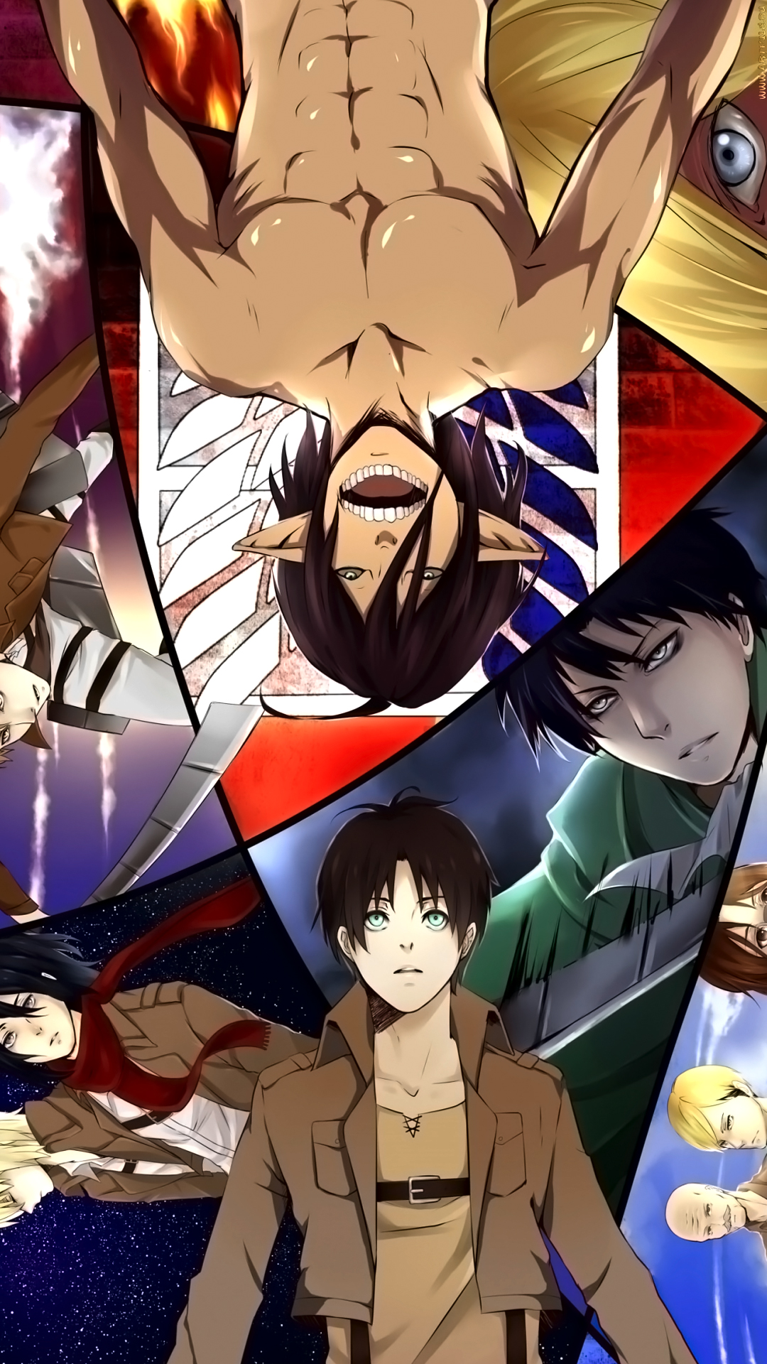 Eren Yeager blickt auf und sieht sich selbst in Titanengestalt. Im Hintergrund die restlichen Charaktere aus dem Anime „Attack on Titan“