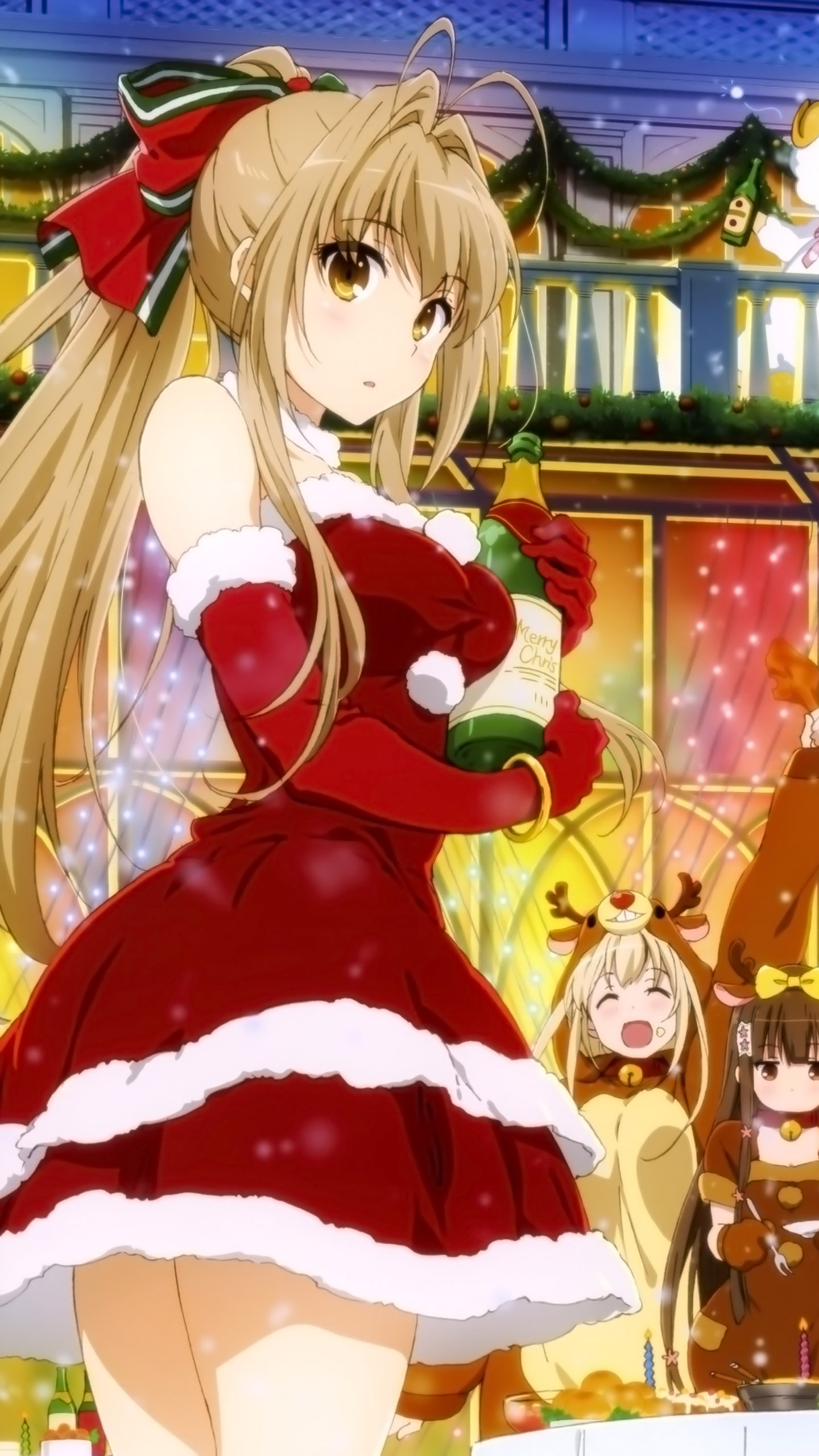 Rusovlasá anime dívka oblečená jako Santa nese tašku dárků. Pomáhá jí malý chlapec v kostýmu jelena