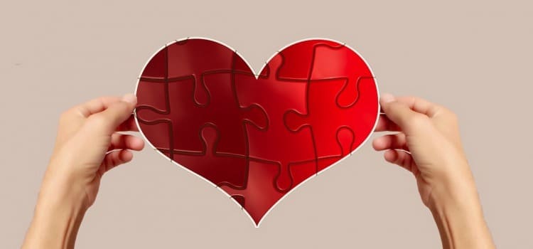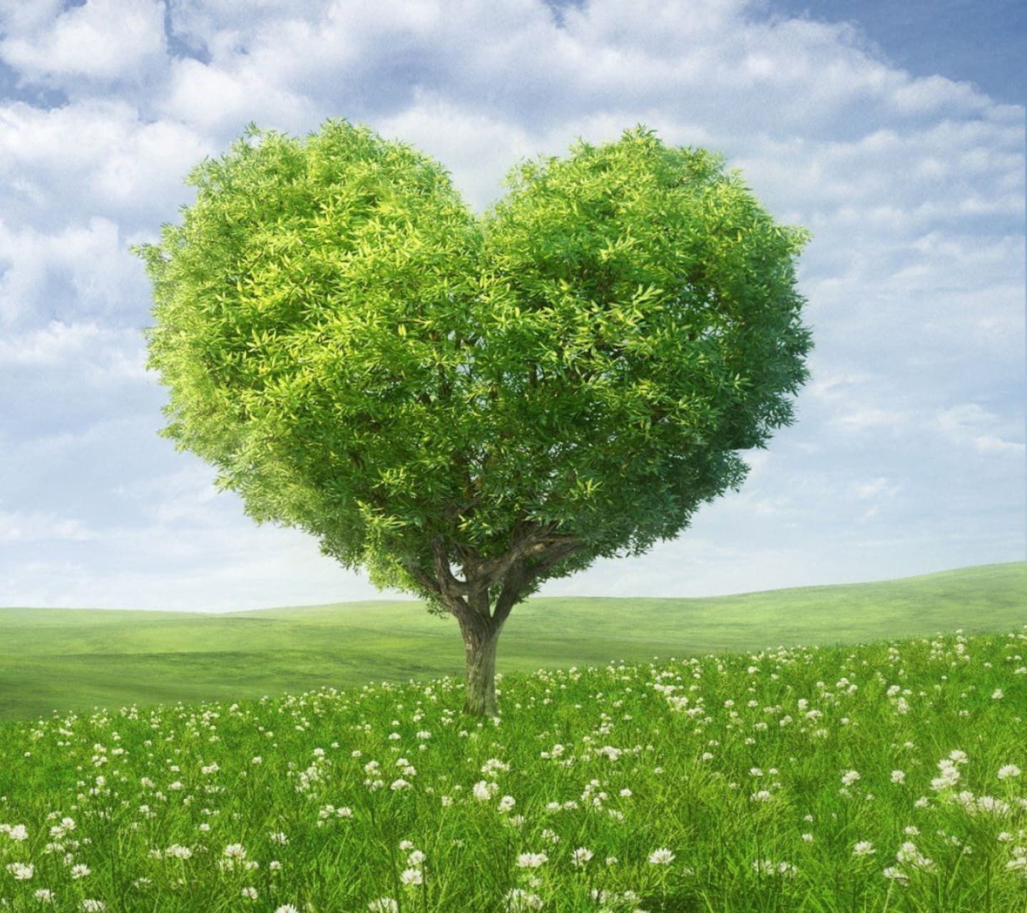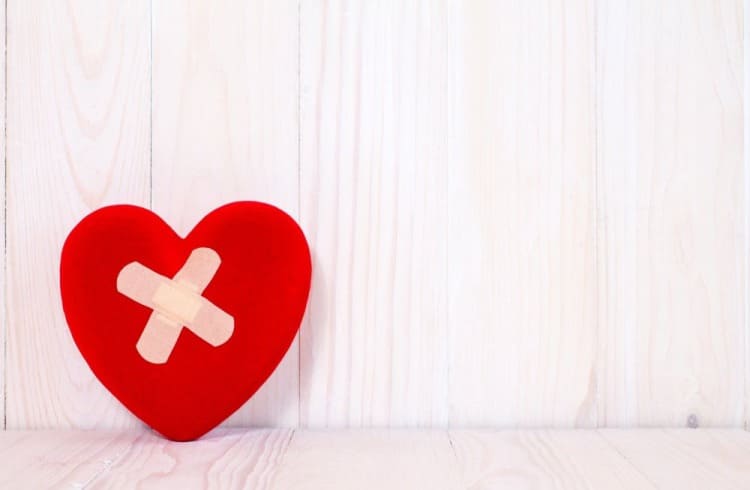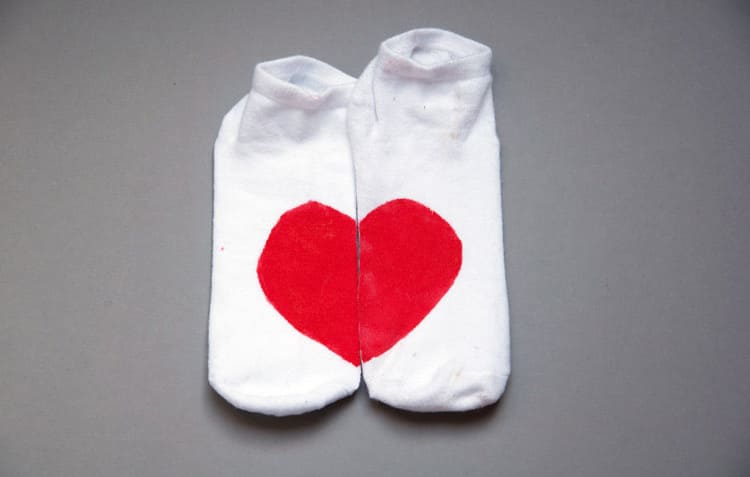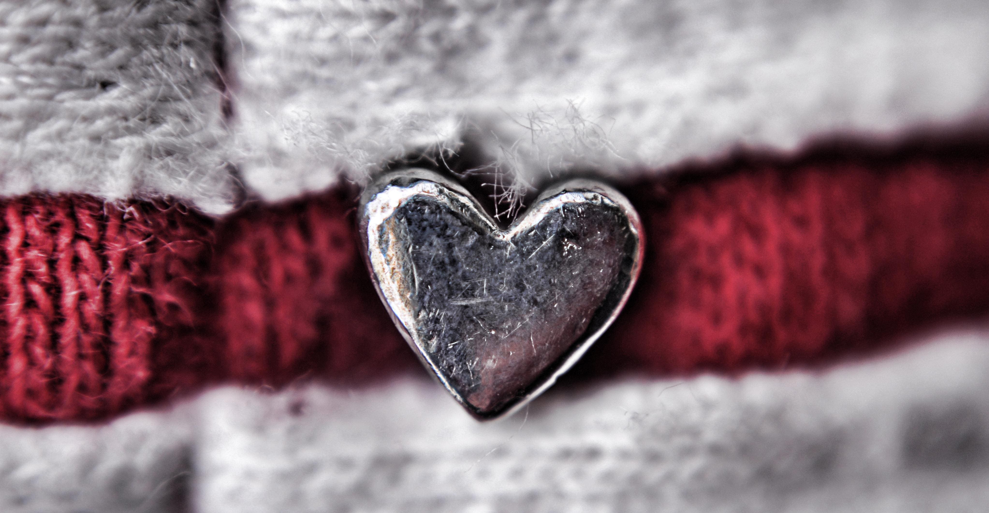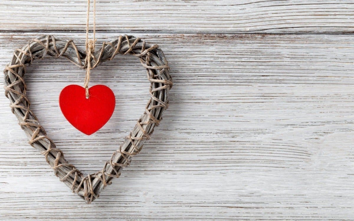Blue flowers and a red box in the shape of a heart on an uneven background
