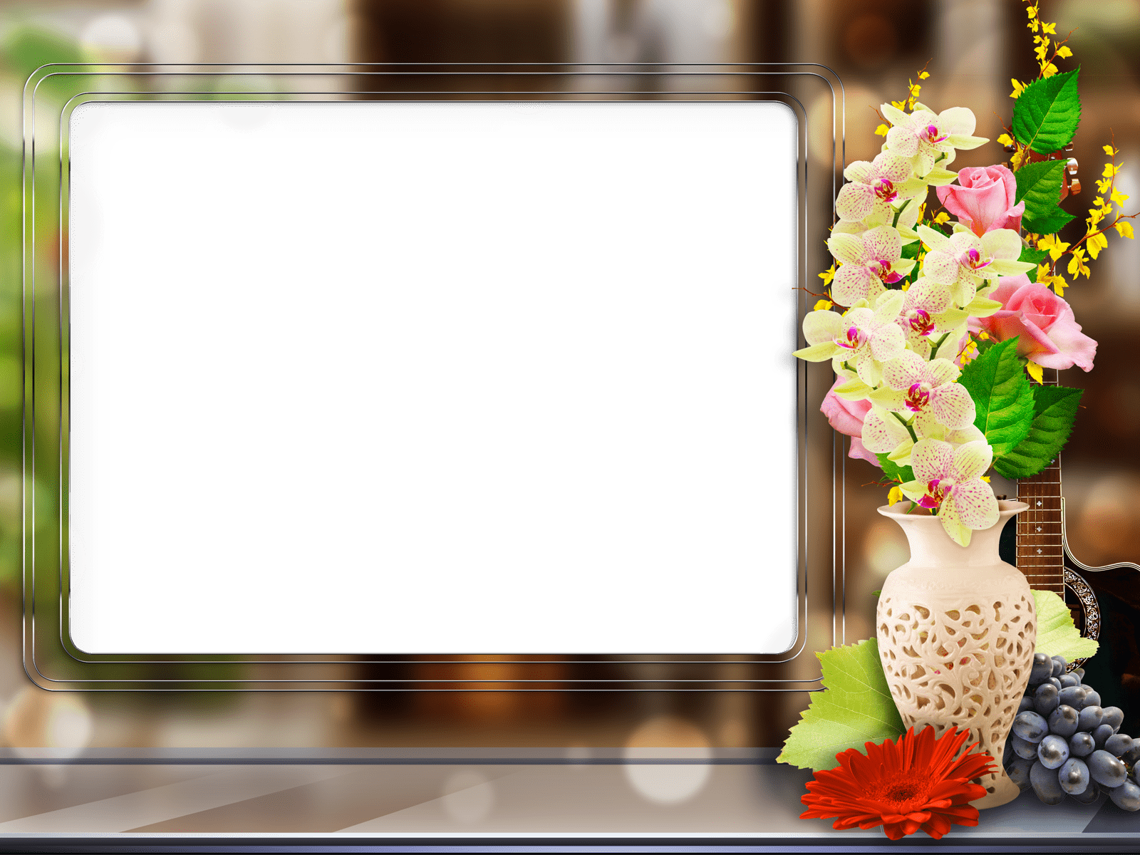 This photo frame is decorated with beautiful flowers of different kinds.
