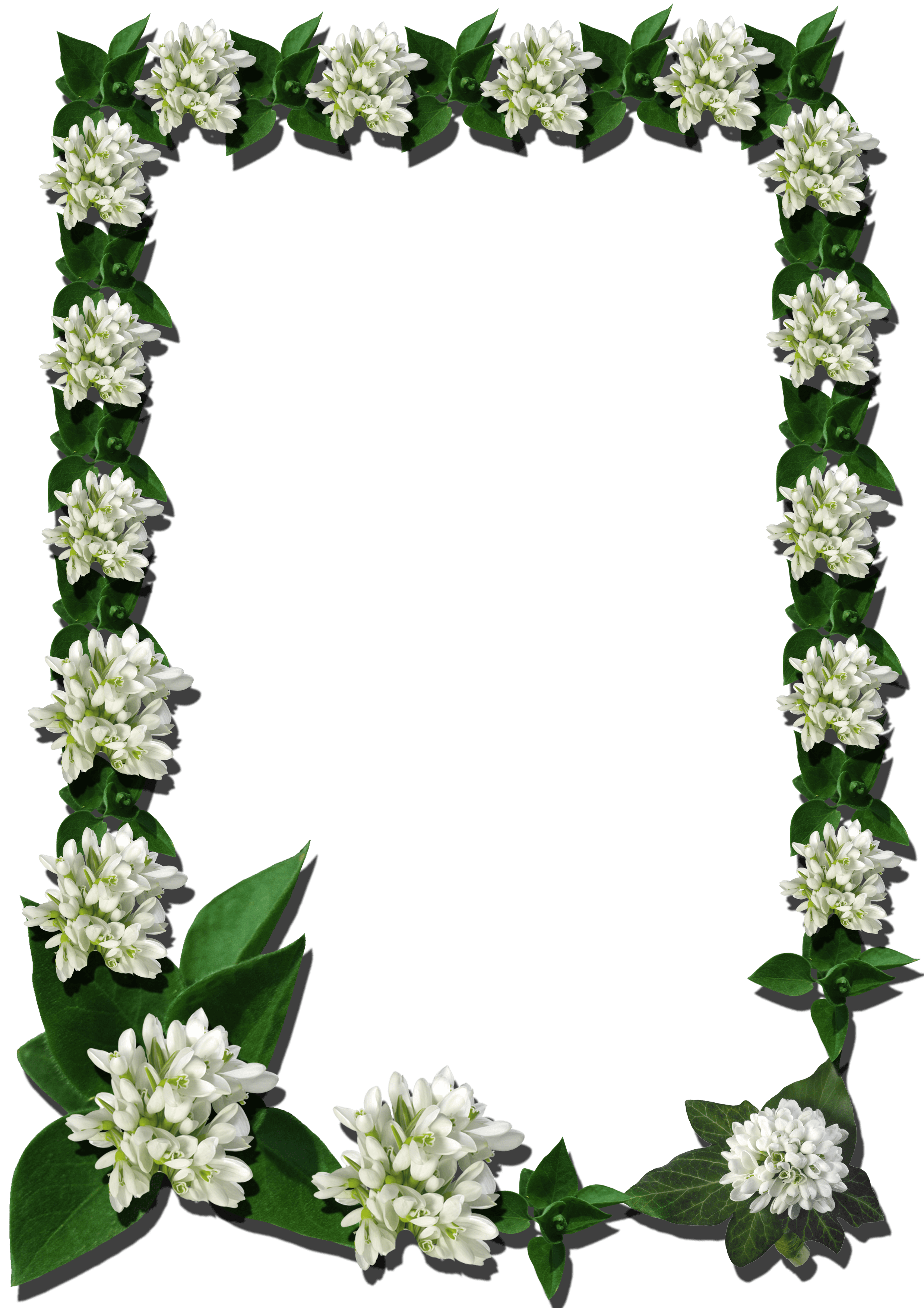 Photo frame made of many white inflorescences with green leaves