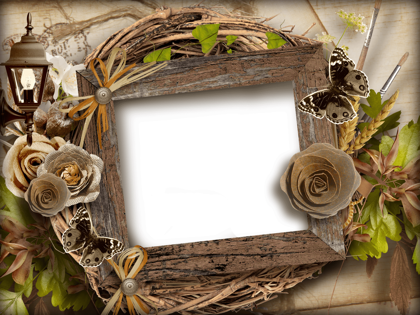 Brown photo frame with flowers, butterflies and a lit lantern.