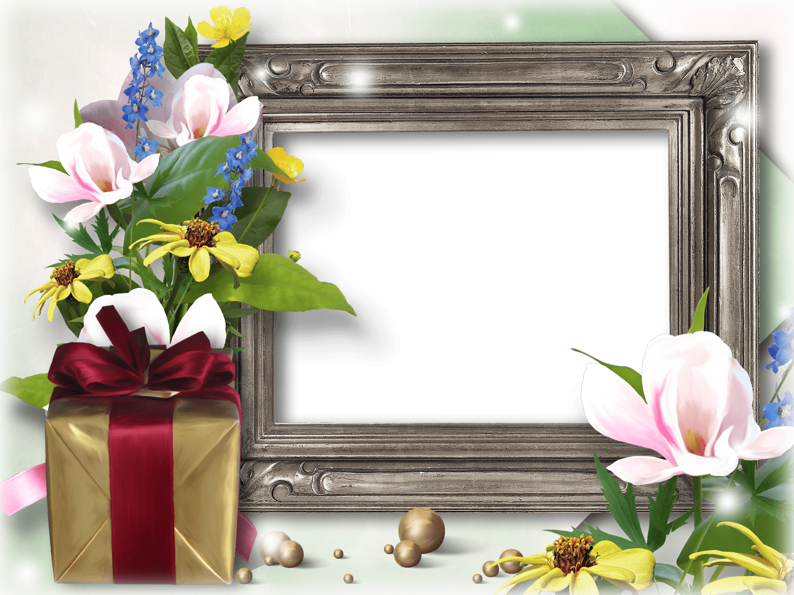 Beautiful wooden frame, flowers and gift box.