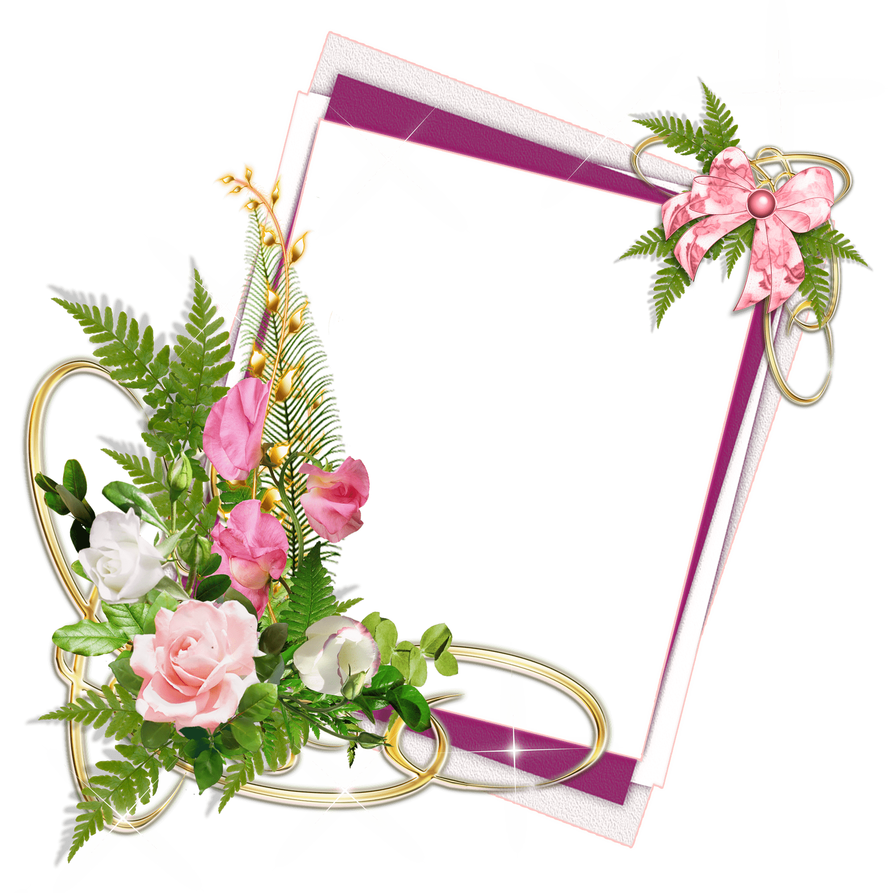 Sparkling white photo frame with pink flowers, transparent ribbons and fluttering butterflies.