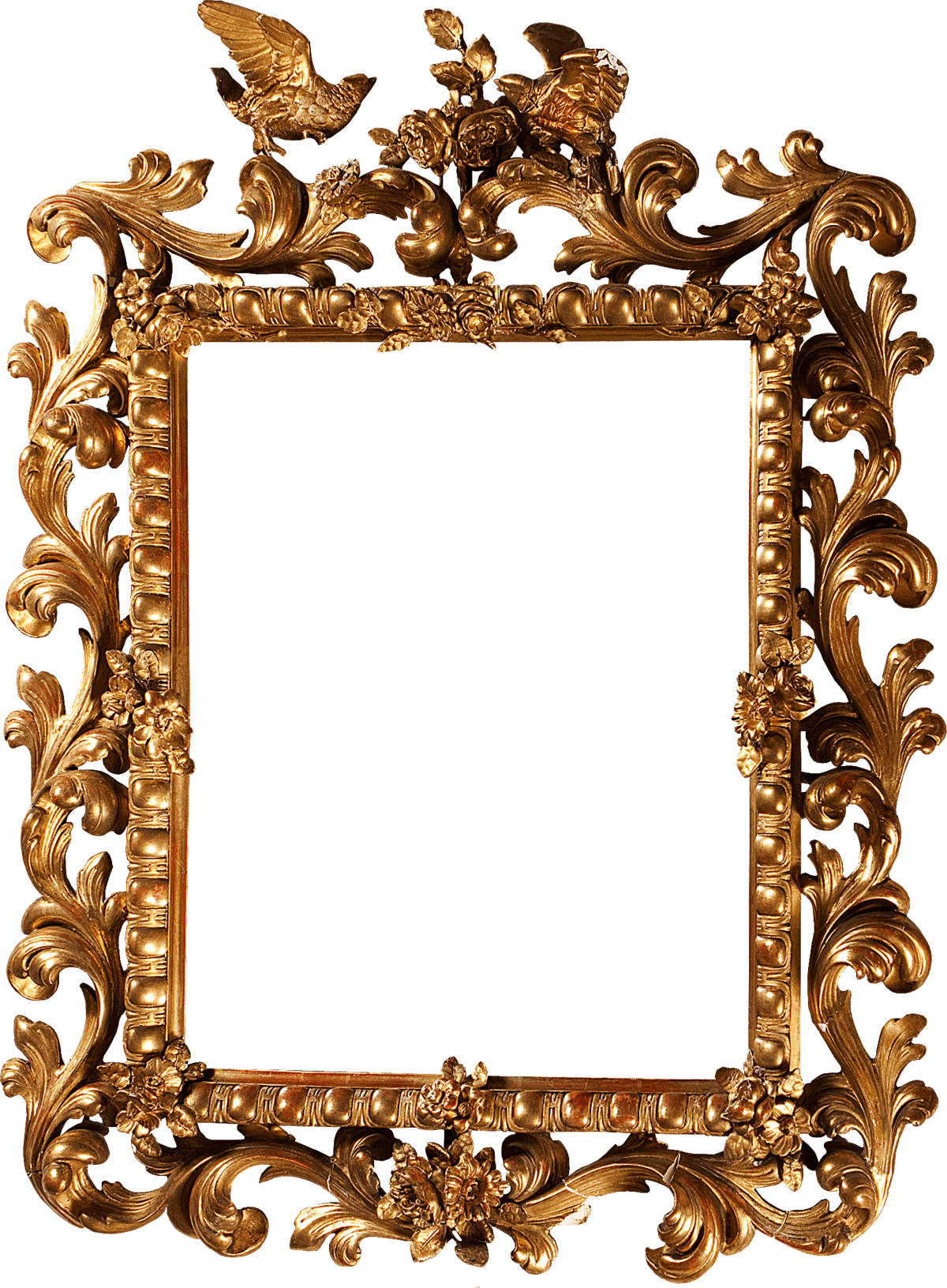 Expensive golden baroque photo frame topped with birds and flowers