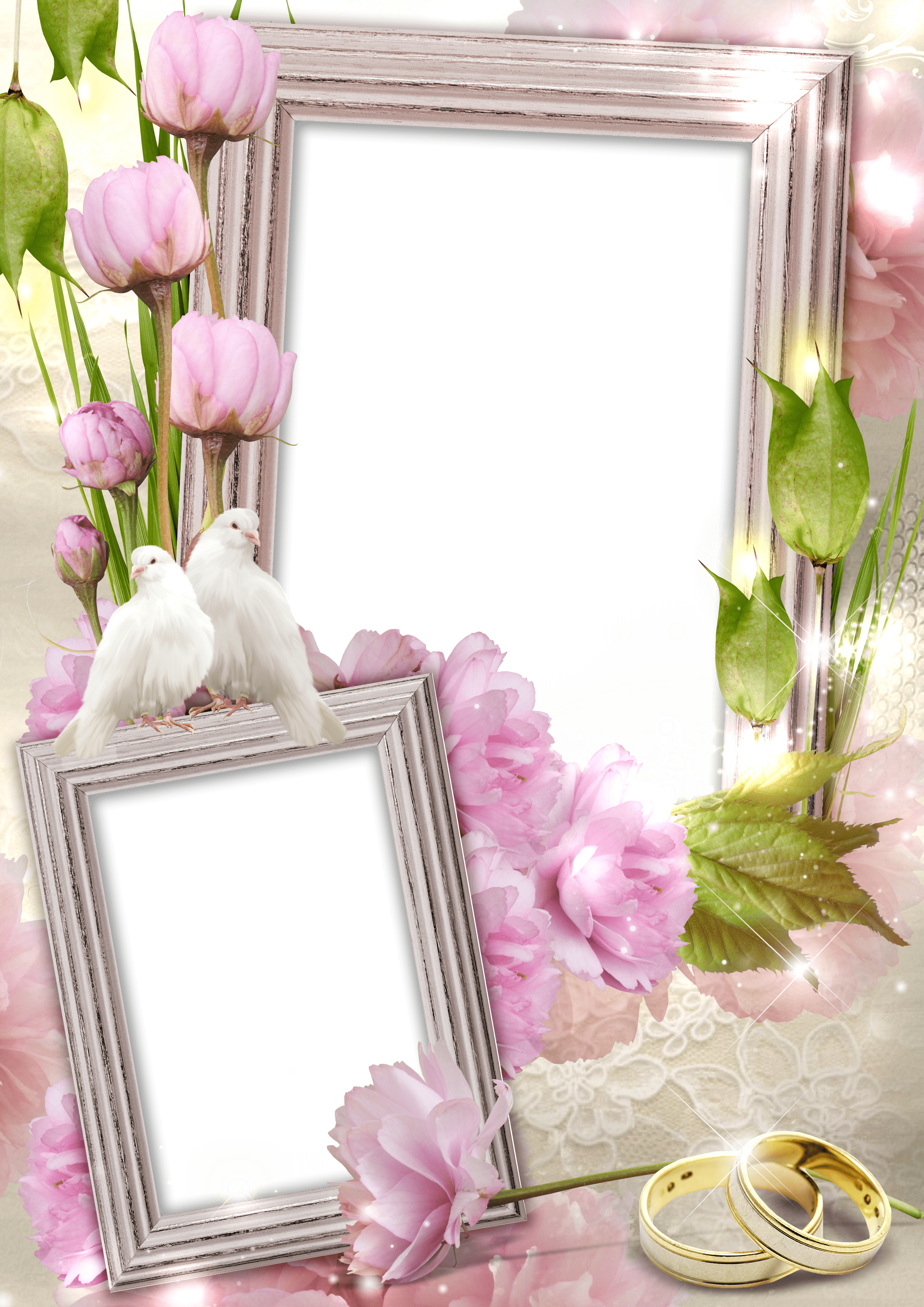 Zwei zarte rosa Fotorahmen mit Eheringen und weißen Tauben.