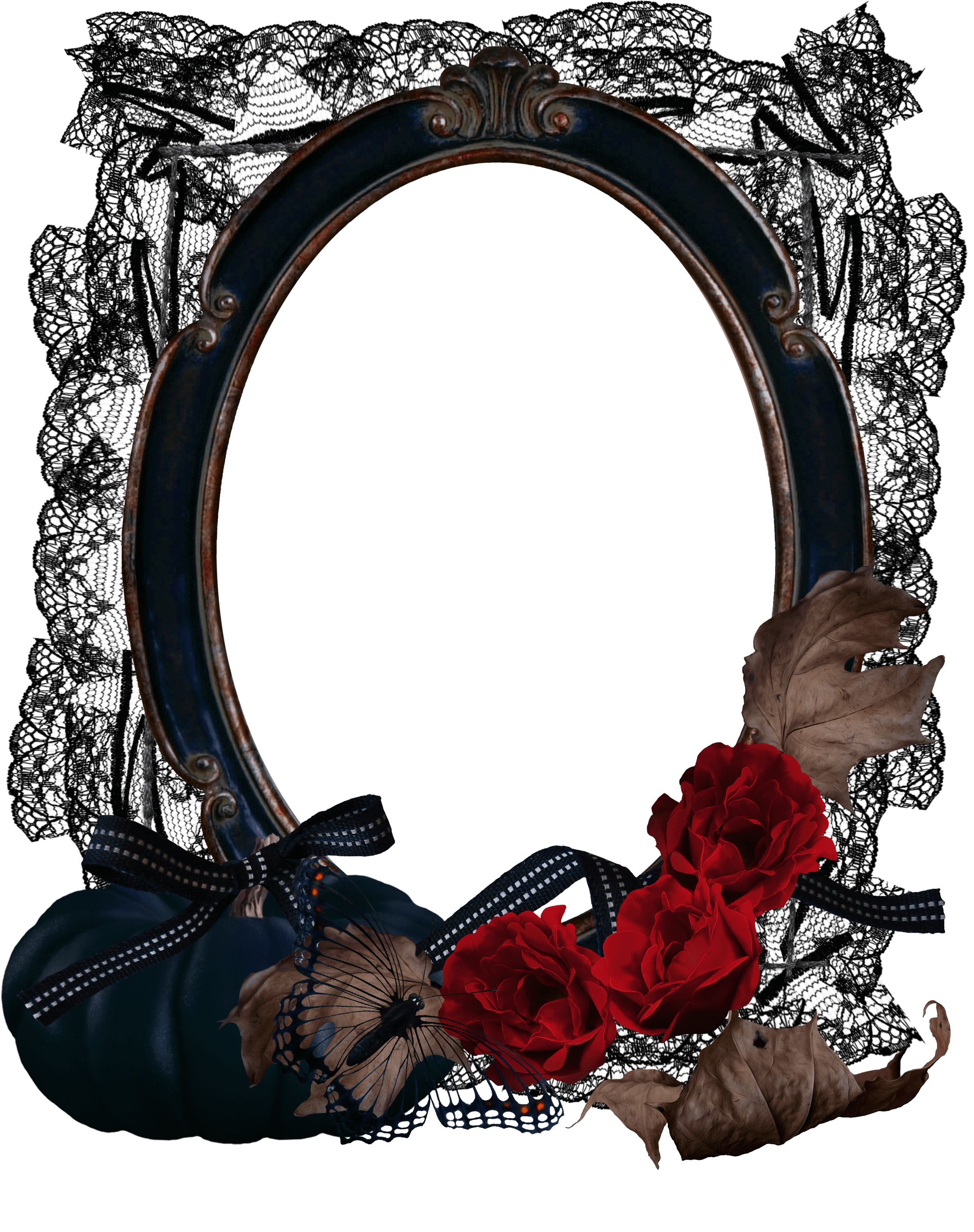Ovaler Fotorahmen mit schwarzer Spitze und roten Rosen