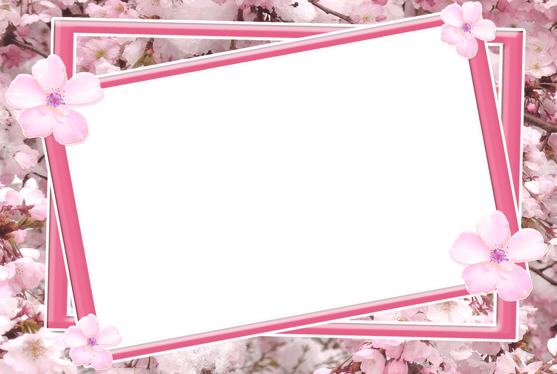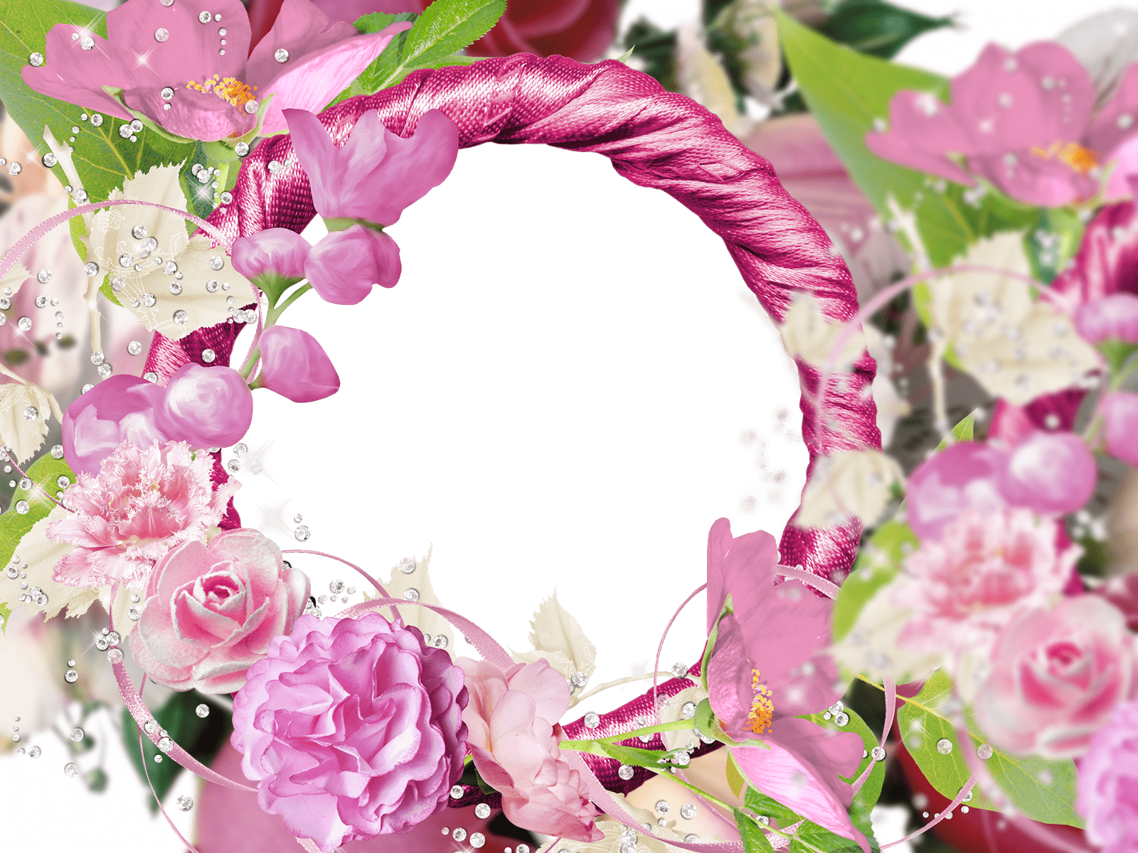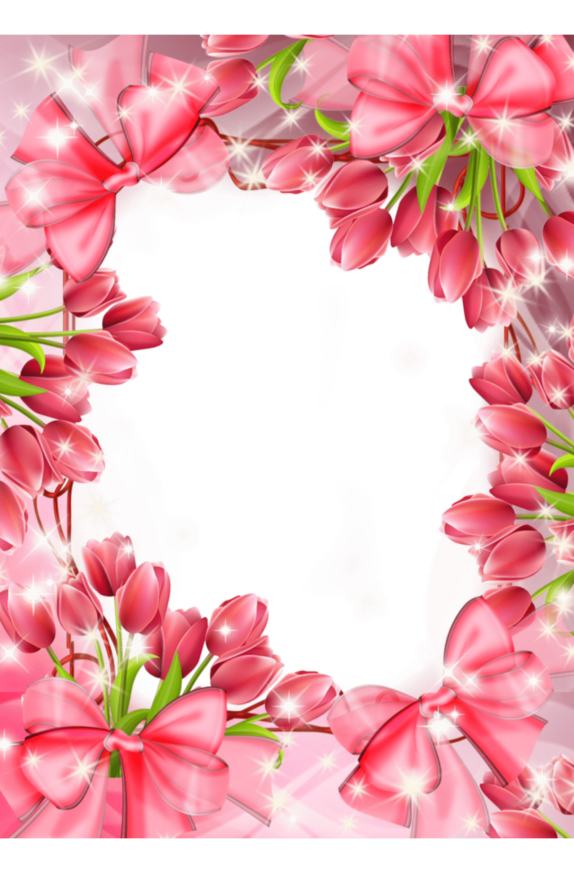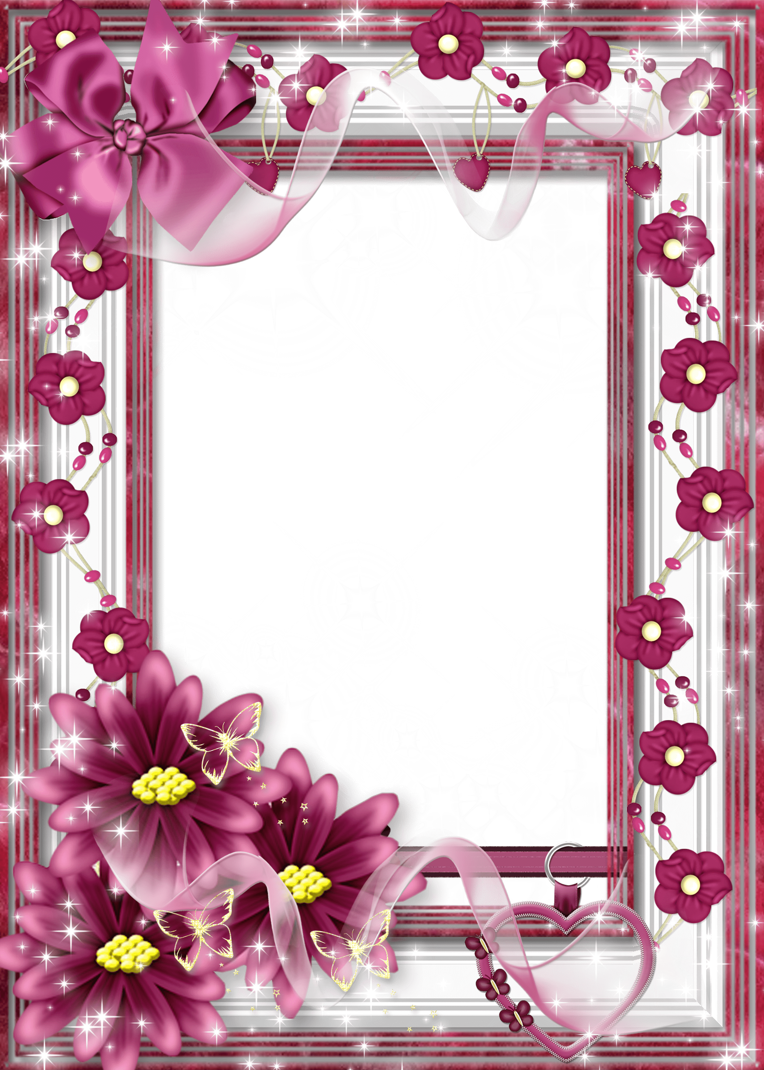 Funkelnder weißer Fotorahmen mit rosa Blumen, transparenten Bändern und flatternden Schmetterlingen.