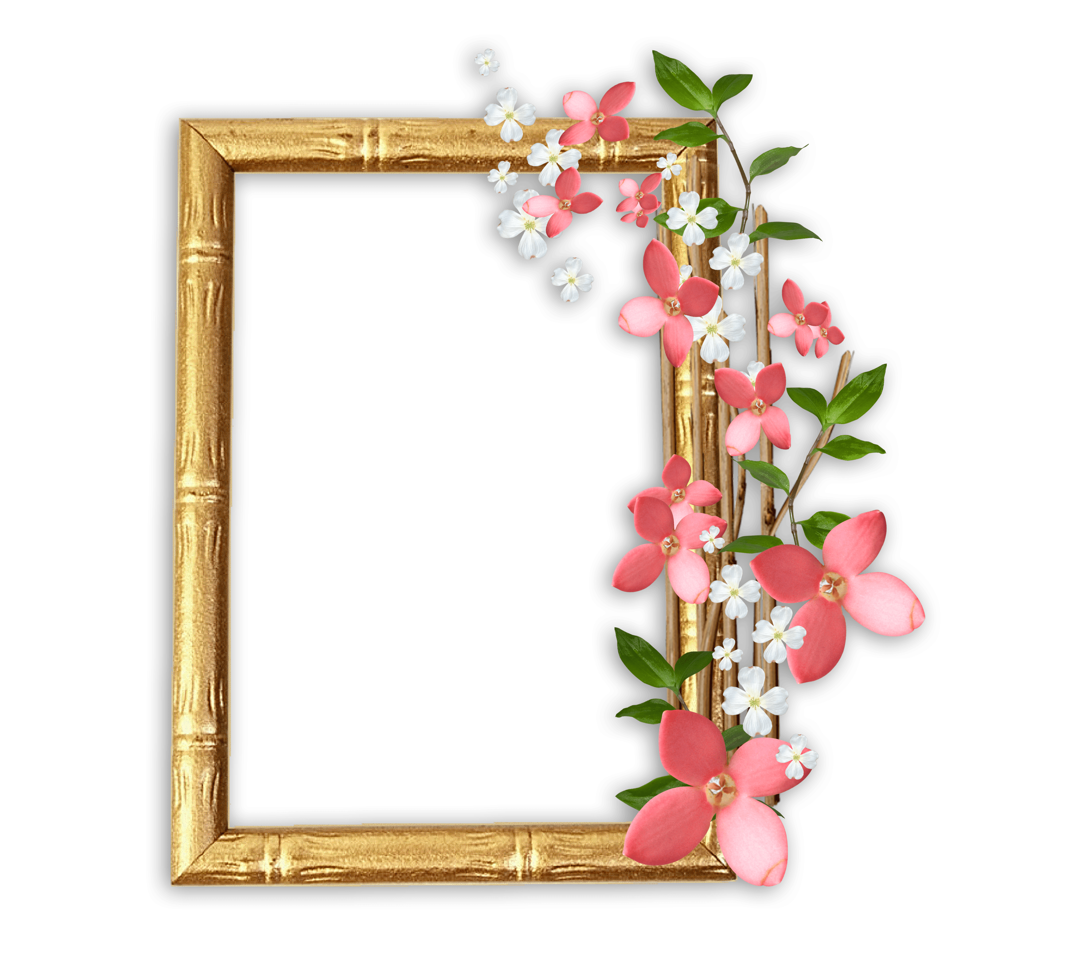 Glänzender goldener Rahmen mit zarten weißen und rosa Blüten.