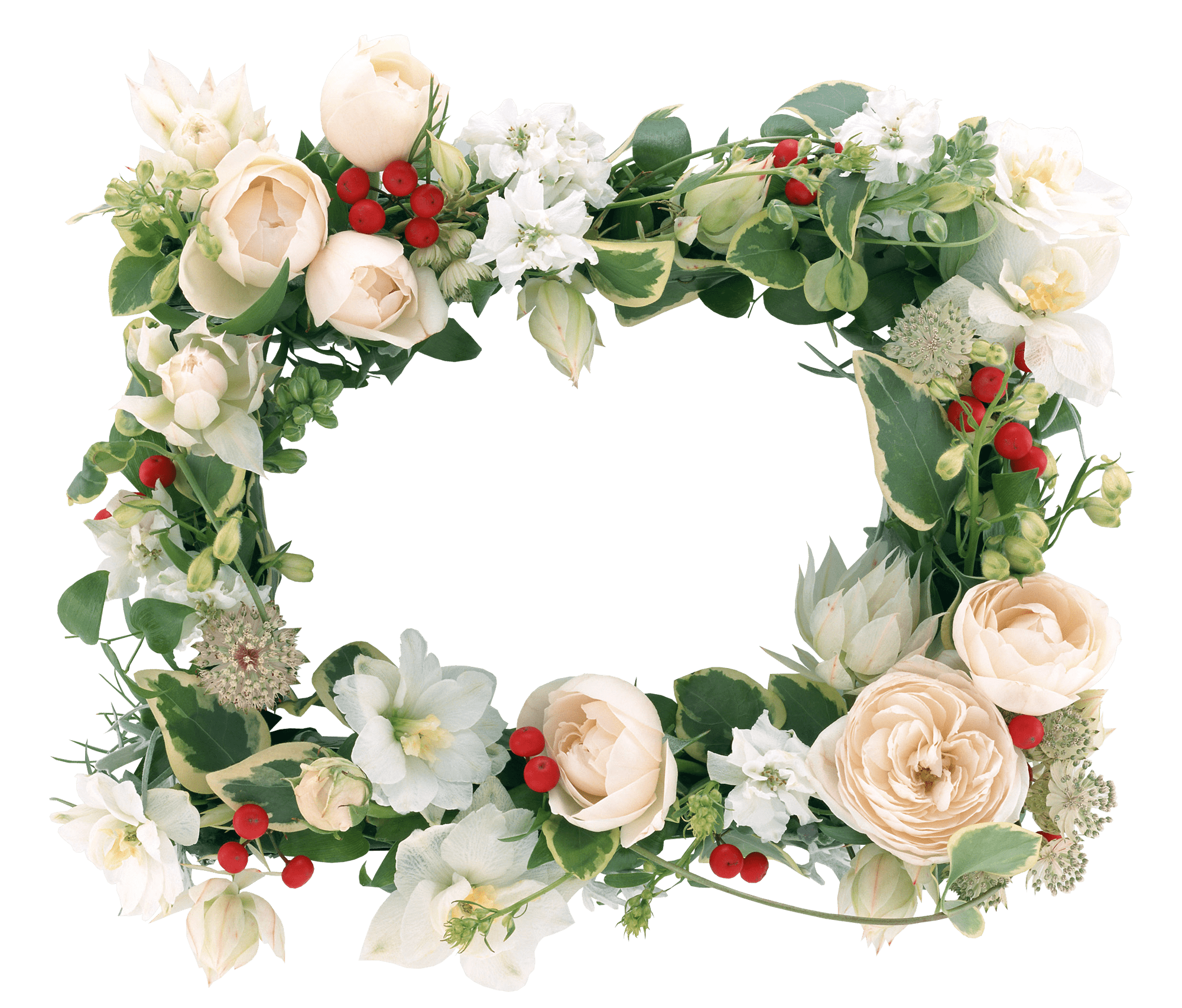 Fotorahmen in Form eines schönen Sommerstraußes aus weißen Blumen, roten Beeren und grünen Blättern