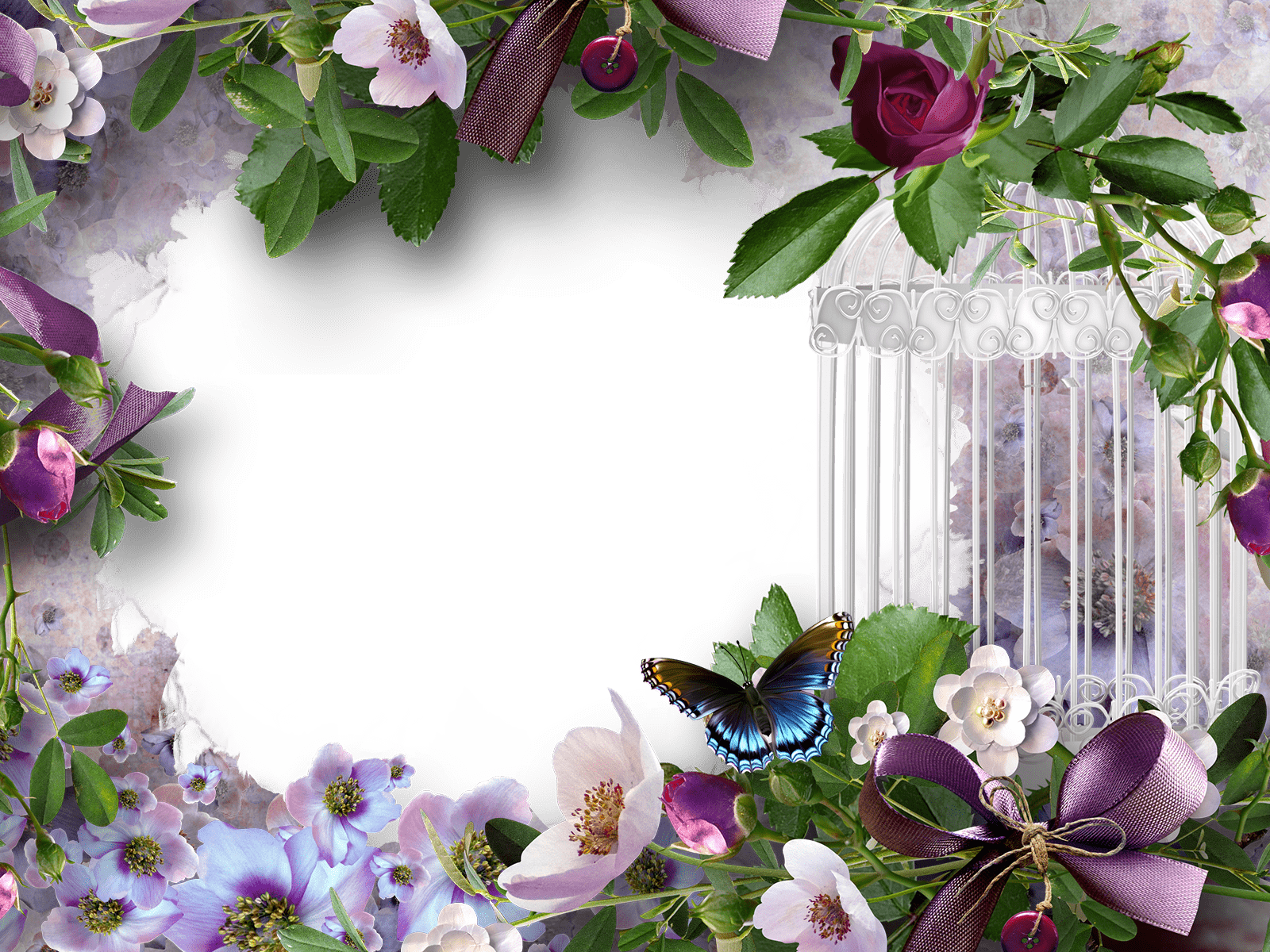Rosa Blumen, ein blauer Schmetterling und ein weißer Käfig sind die perfekte Kulisse für Ihr Lieblingsfoto.