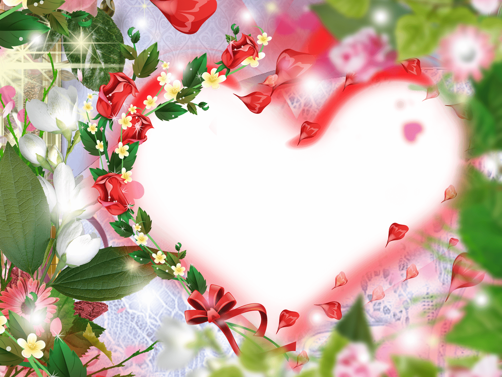 Ein Rahmen in Form eines Herzens auf einem Hintergrund aus Blumen ist eine ausgezeichnete Wahl für ein Foto eines geliebten Menschen