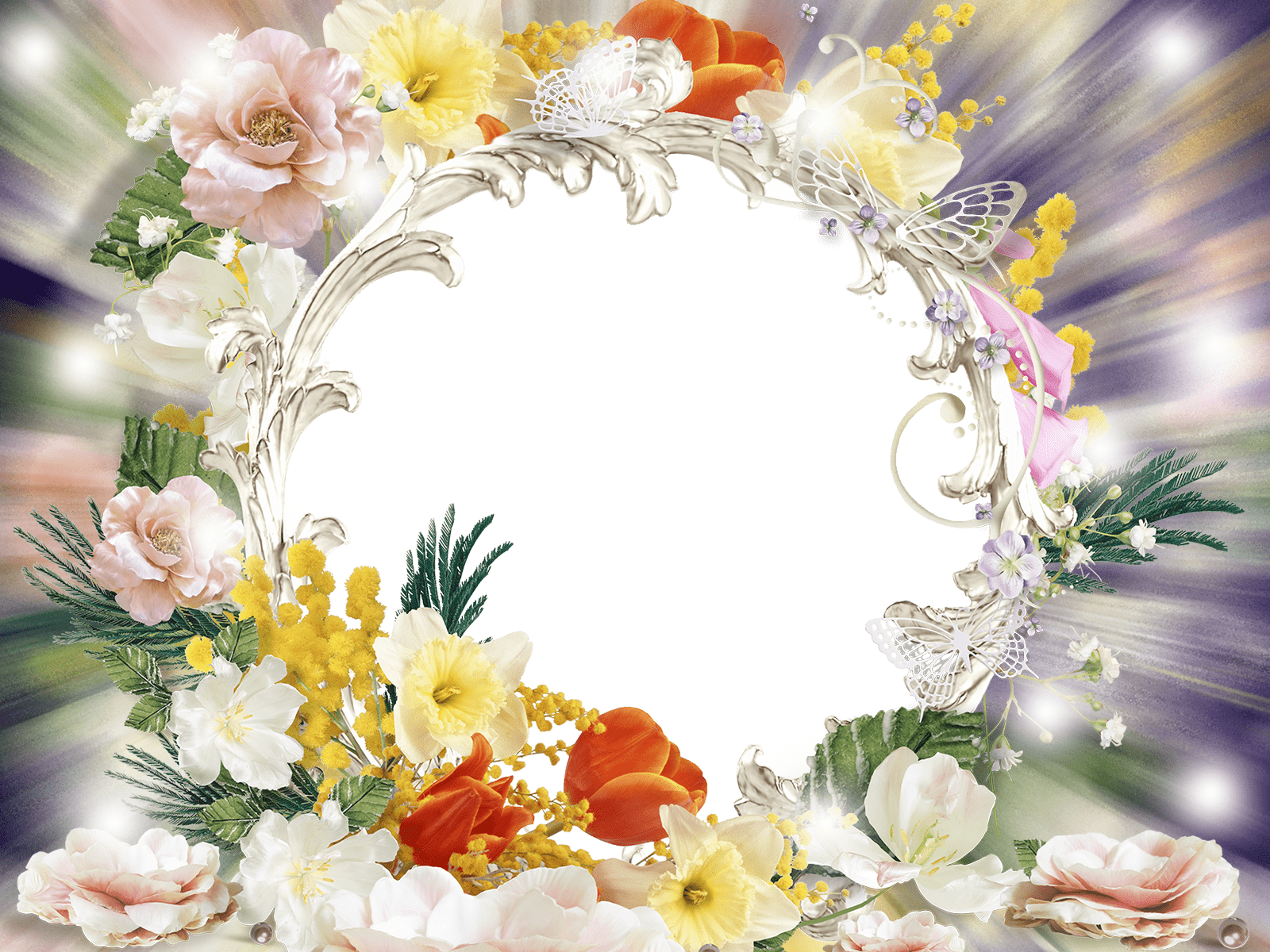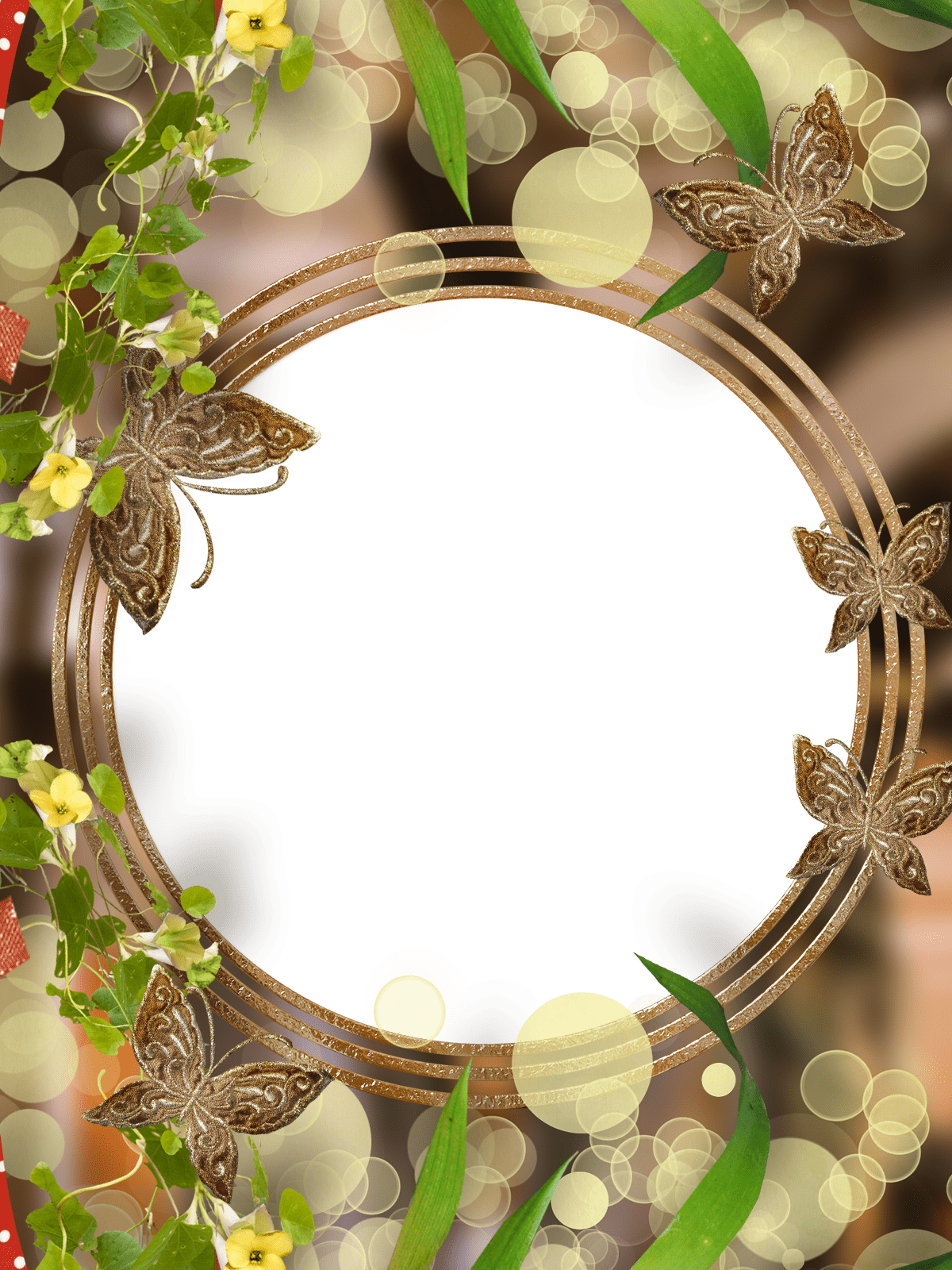Runder Fotorahmen mit Schmetterlingen und Blumen auf einem unscharfen Hintergrund.