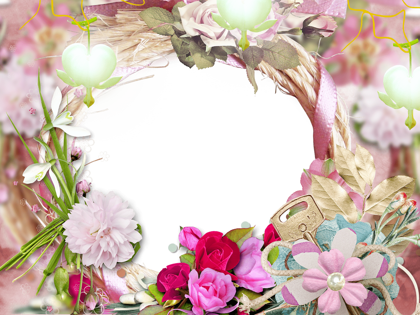 Fotorahmen in Form eines Kranzes mit zarten Blüten und grünen Blättern.