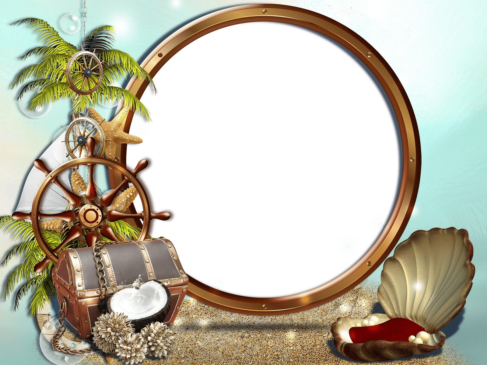 Ein runder hölzerner Fotorahmen ähnelt einem Bullauge in einem versunkenen Schiff. Für Liebhaber des Meeres