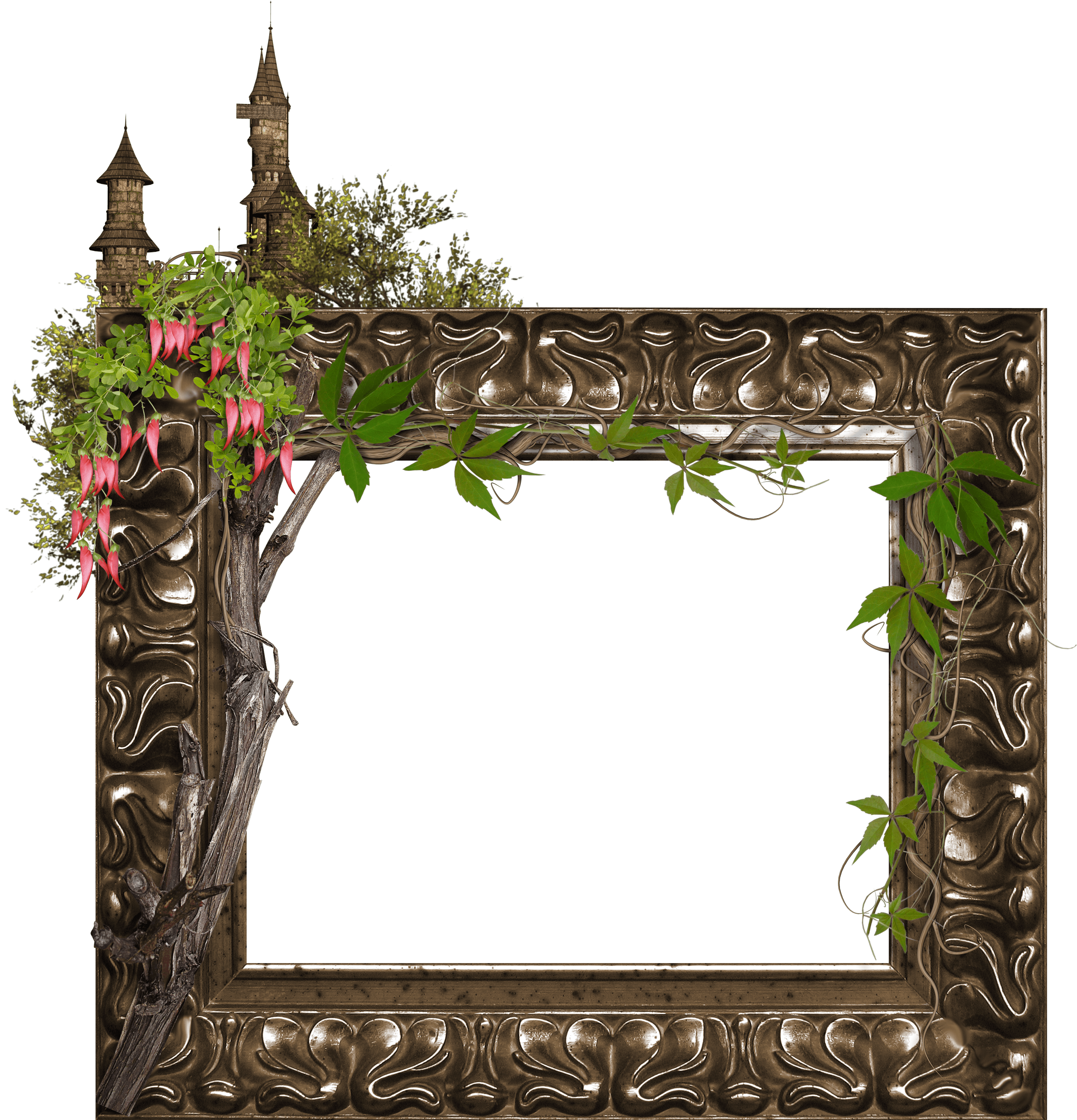 Ungewöhnlicher Fotorahmen mit Märchenschloss und grünem Efeu