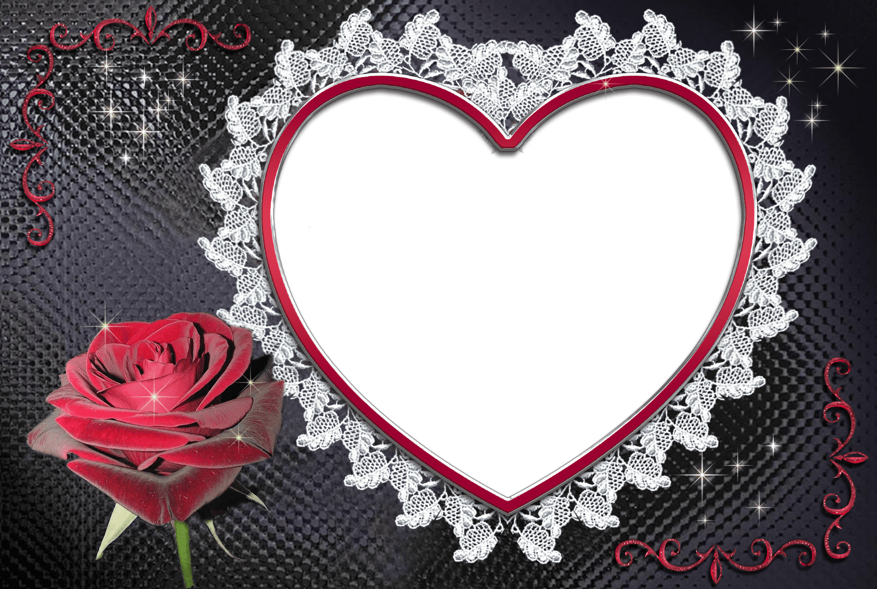 Herzförmiger Fotorahmen mit roter Rose auf schwarzem Hintergrund