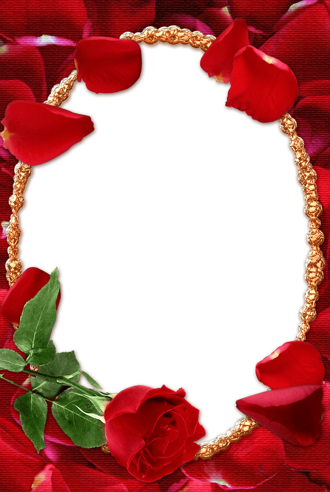 Goldener ovaler Fotorahmen mit roten Rosenblättern. Ein gutes Geschenk für Ihre geliebte Frau