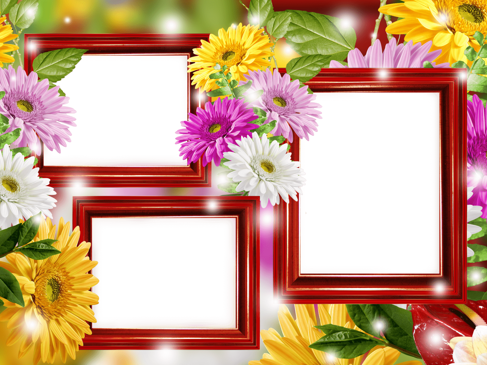 Drei hölzerne Fotorahmen auf einem Hintergrund von mehrfarbigen Gerbera