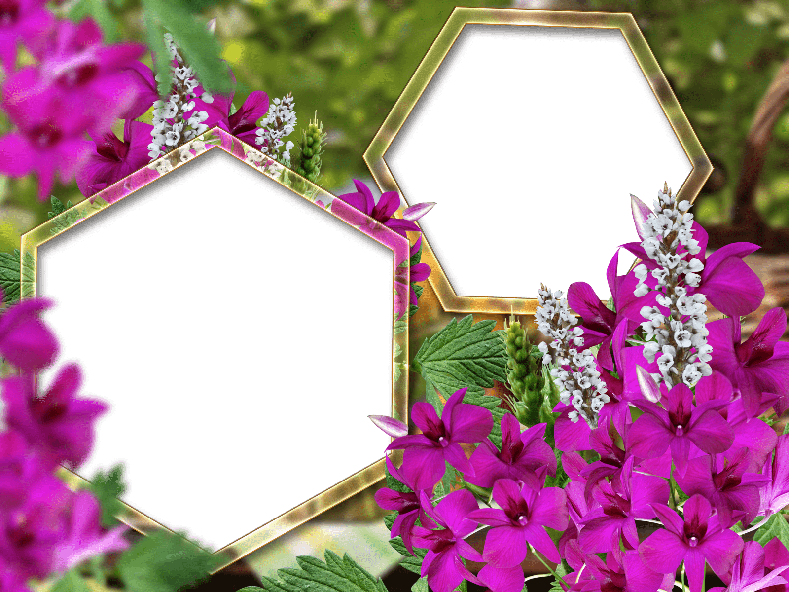 Zwei Fotorahmen in Form von Sechsecken auf einem Hintergrund von Blumen und Laub