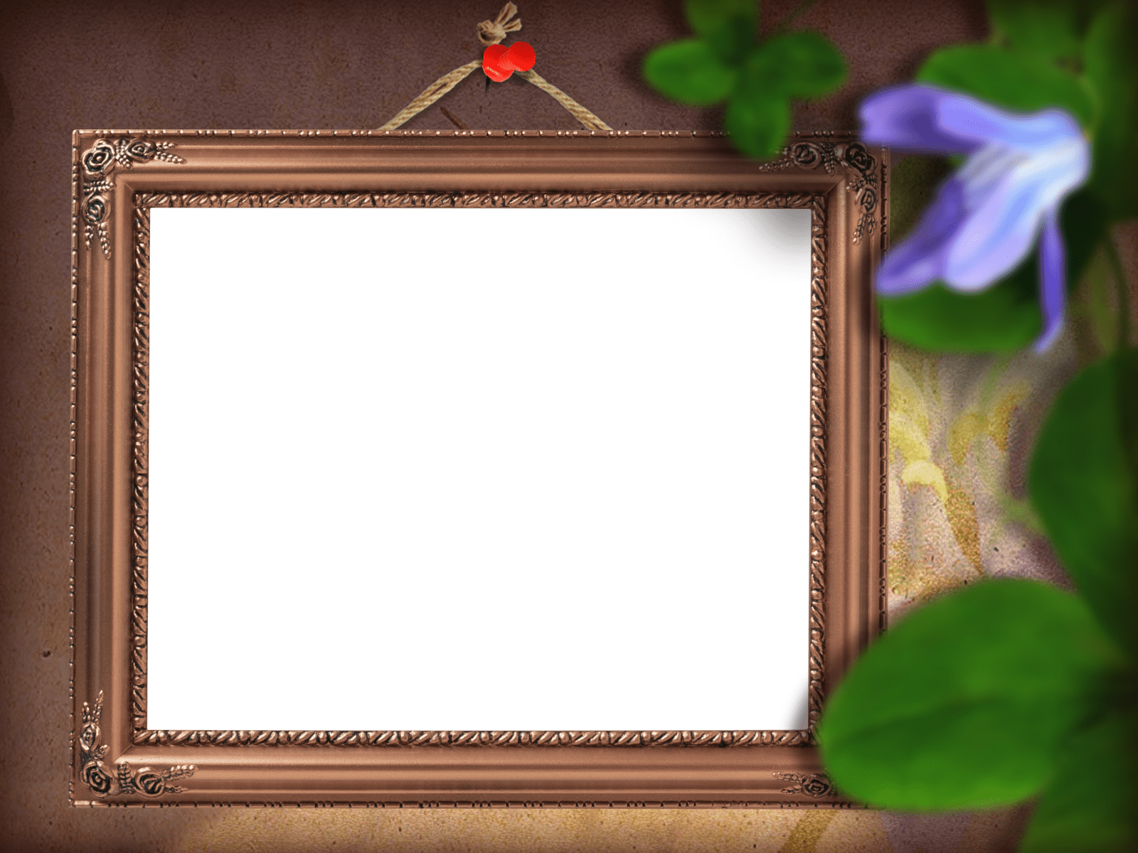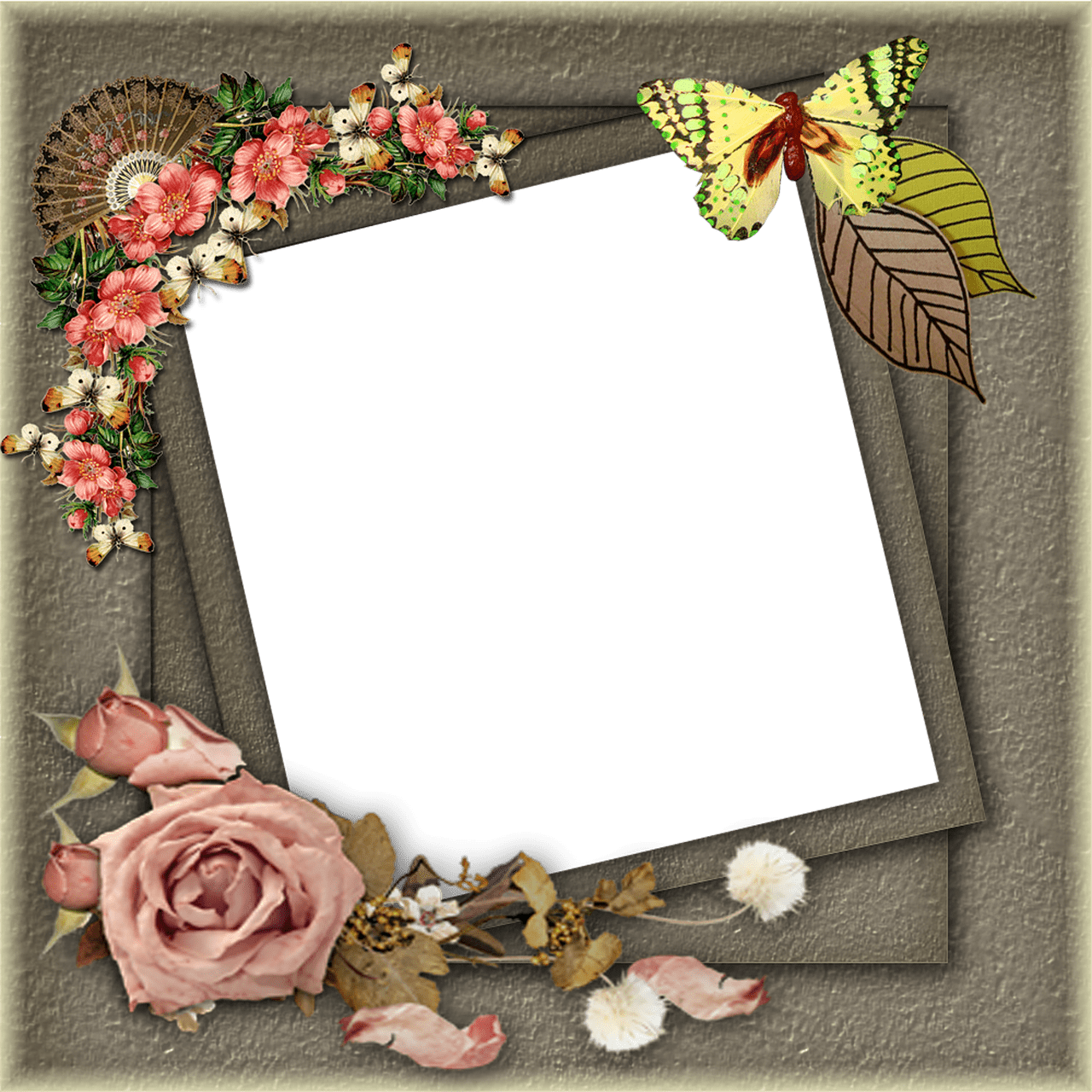 Brauner Fotorahmen mit Blumen, Schmetterlingen und einer beleuchteten Laterne.