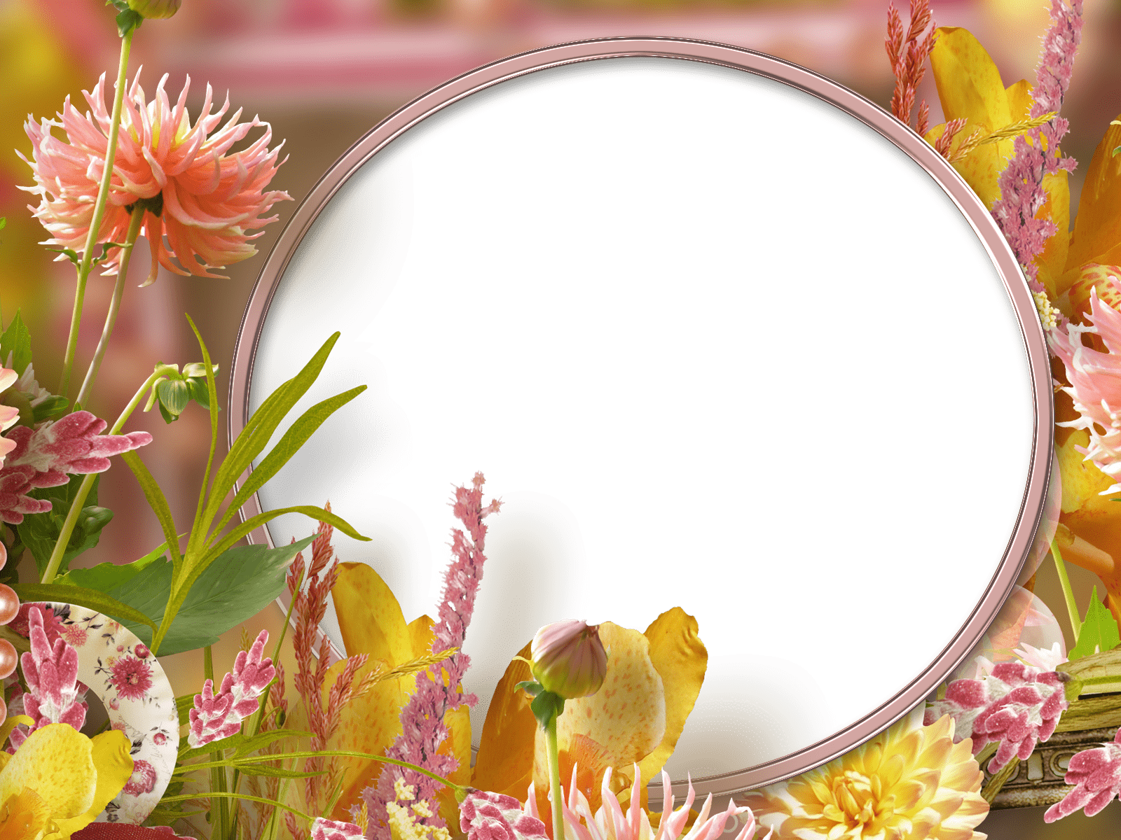 Runder Fotorahmen mit schönen Blumen auf einem unscharfen Hintergrund