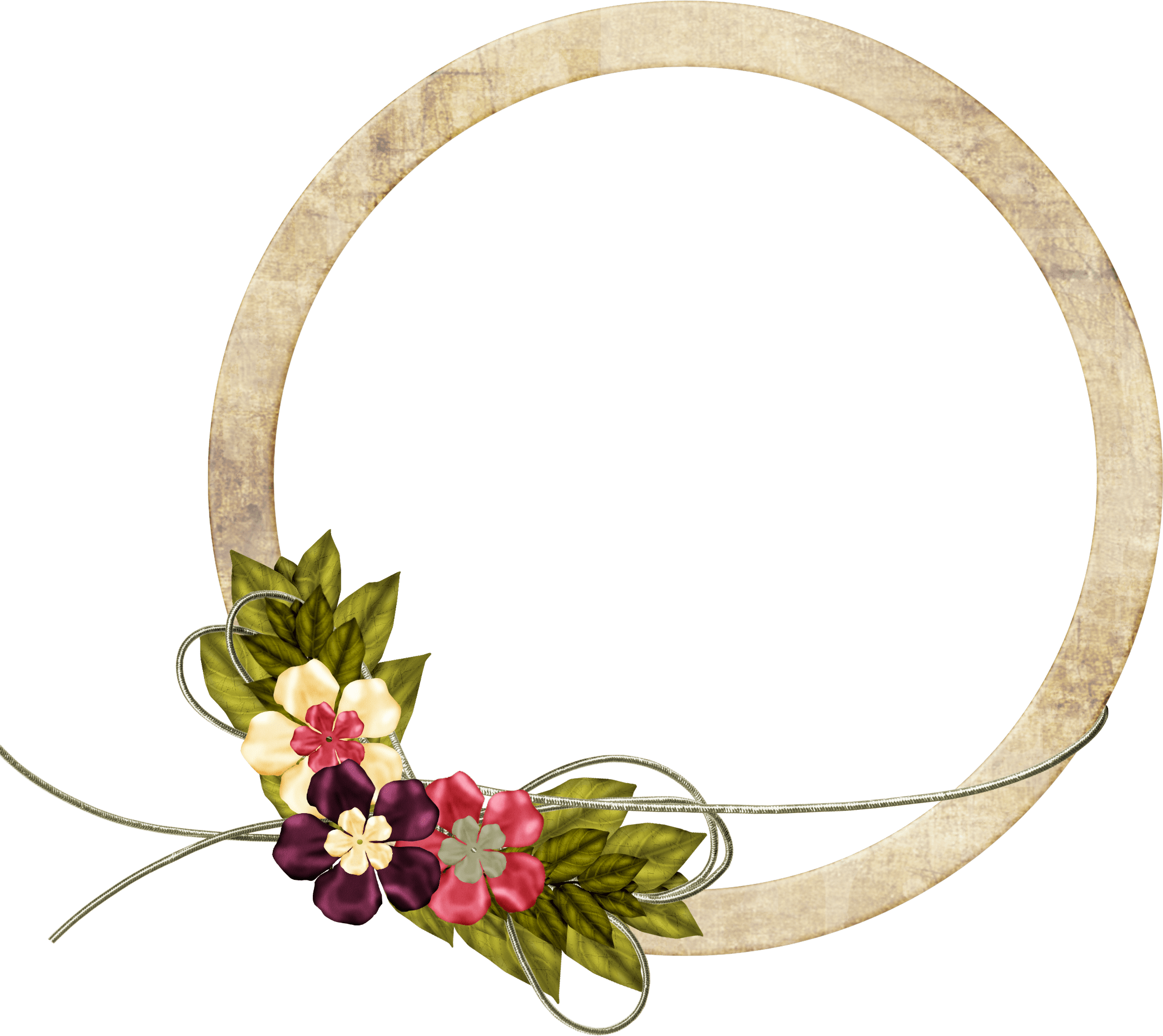 Runder hölzerner Fotorahmen auf einem hellen Hintergrund mit Blumendekorationen