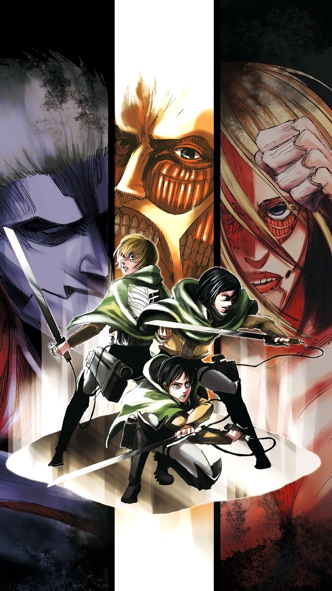 Il ritratto di Eren รจ diviso in due parti: il suo aspetto umano e il titano. E nel mezzo, lo stesso Eren รจ in piena crescita