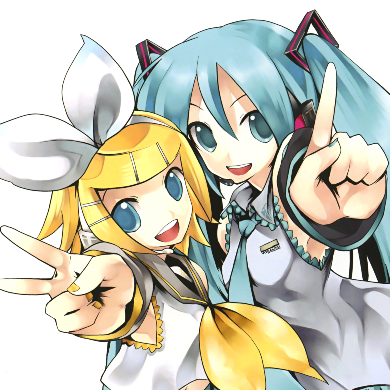 青い背景のリンとレンは背中でお互いを押します
