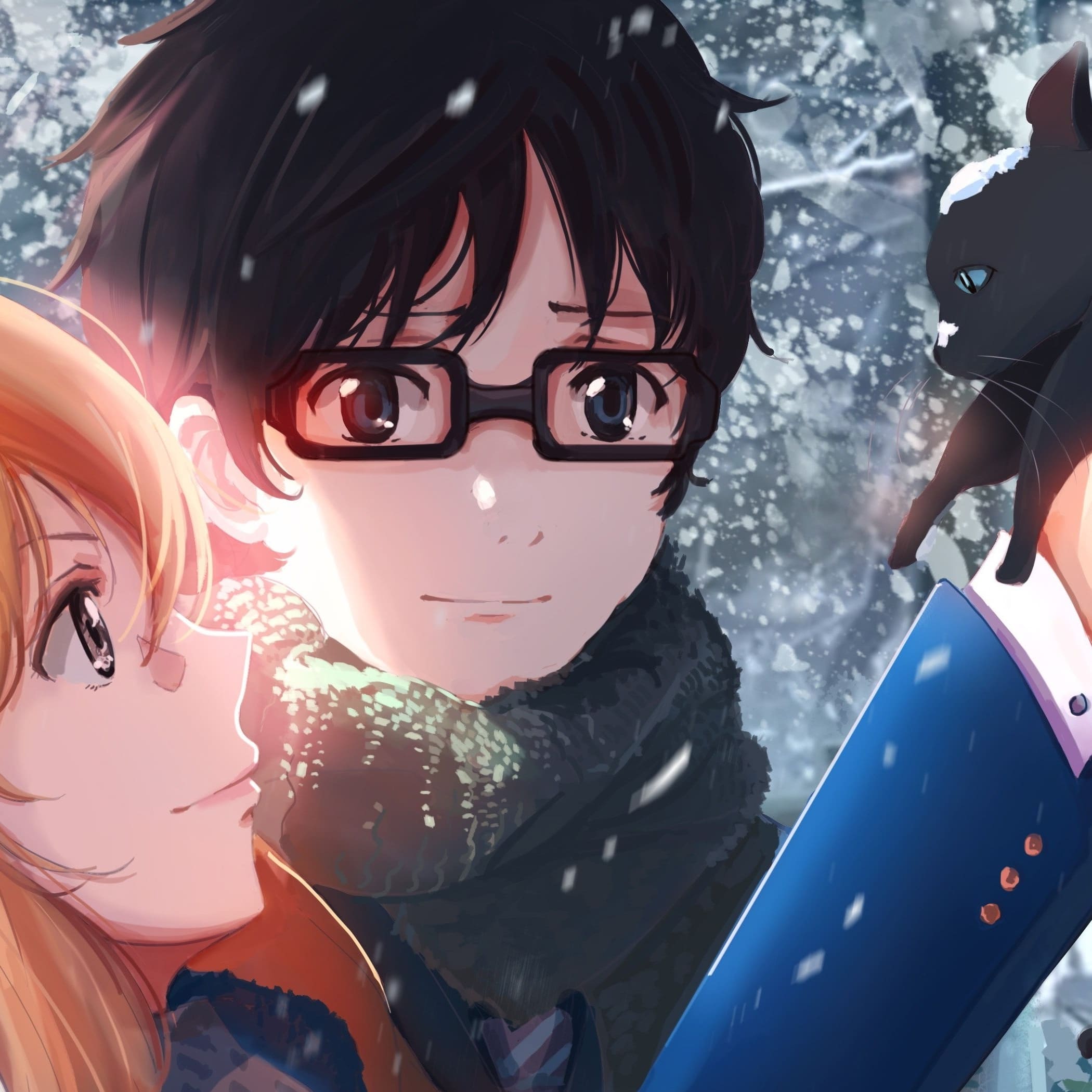 明るい女の子と眼鏡をかけた男が壁の後ろにしゃがみ込んだアニメ