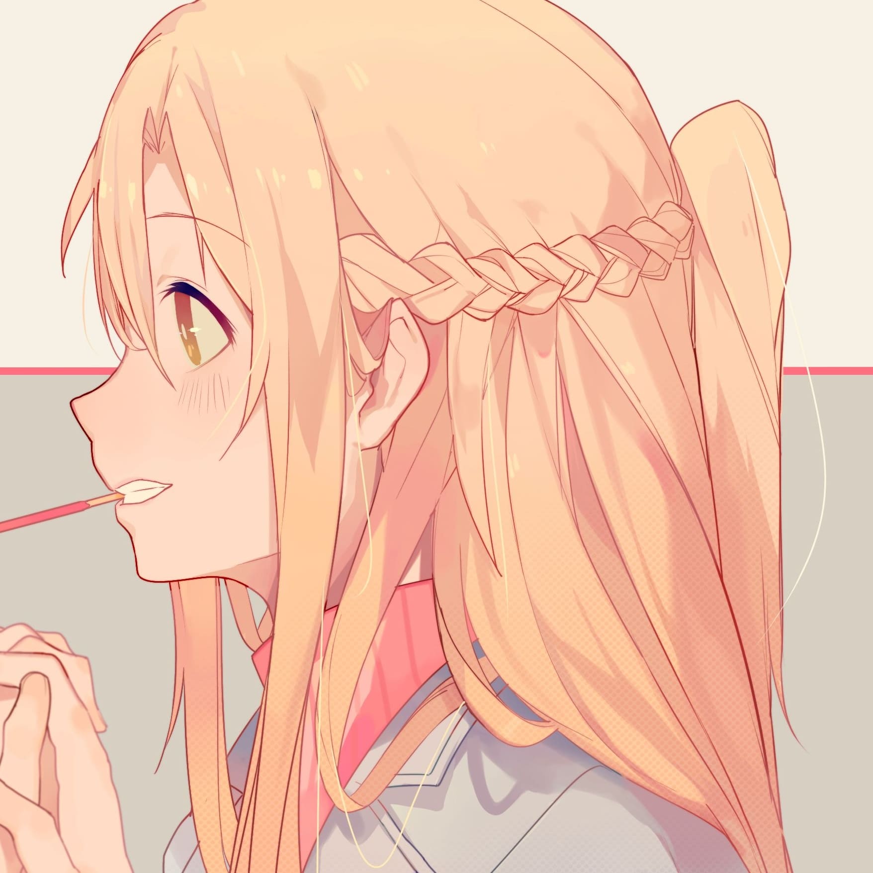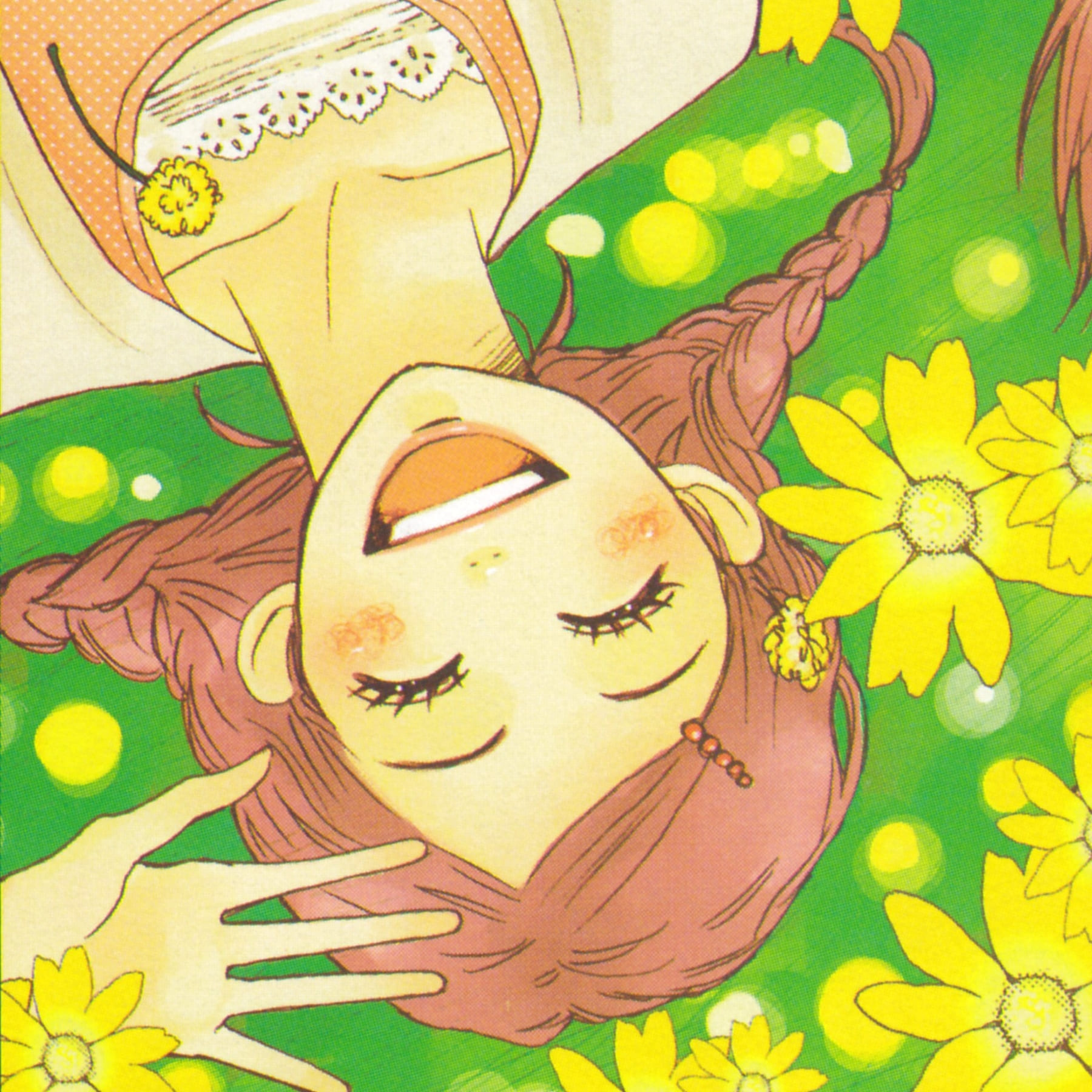 彼女の髪に黄色い花とおさげの男を持つアニメの女の子