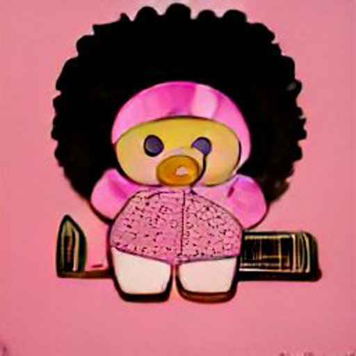 Lalafanfan-Ente trägt ein rosa T-Shirt, einen kurzen Umhang und eine Perücke mit schwarzen Afro-Locken