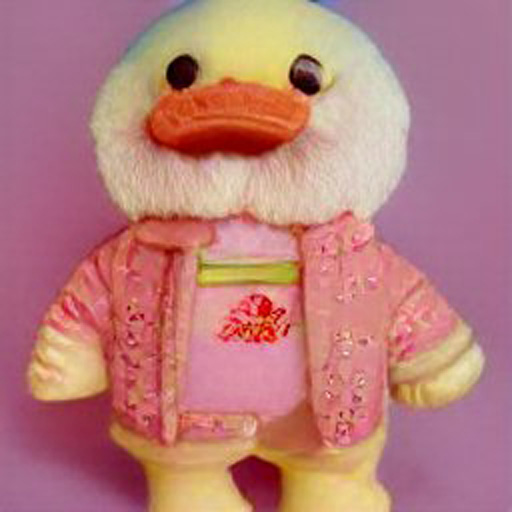 Die Lalafanfan-Ente trägt einen hellpfirsichfarbenen Anzug mit buntem Kragen, Klappen an den Taschen, einem Hut mit buntem Band und einer schwarzen Verzierung darauf