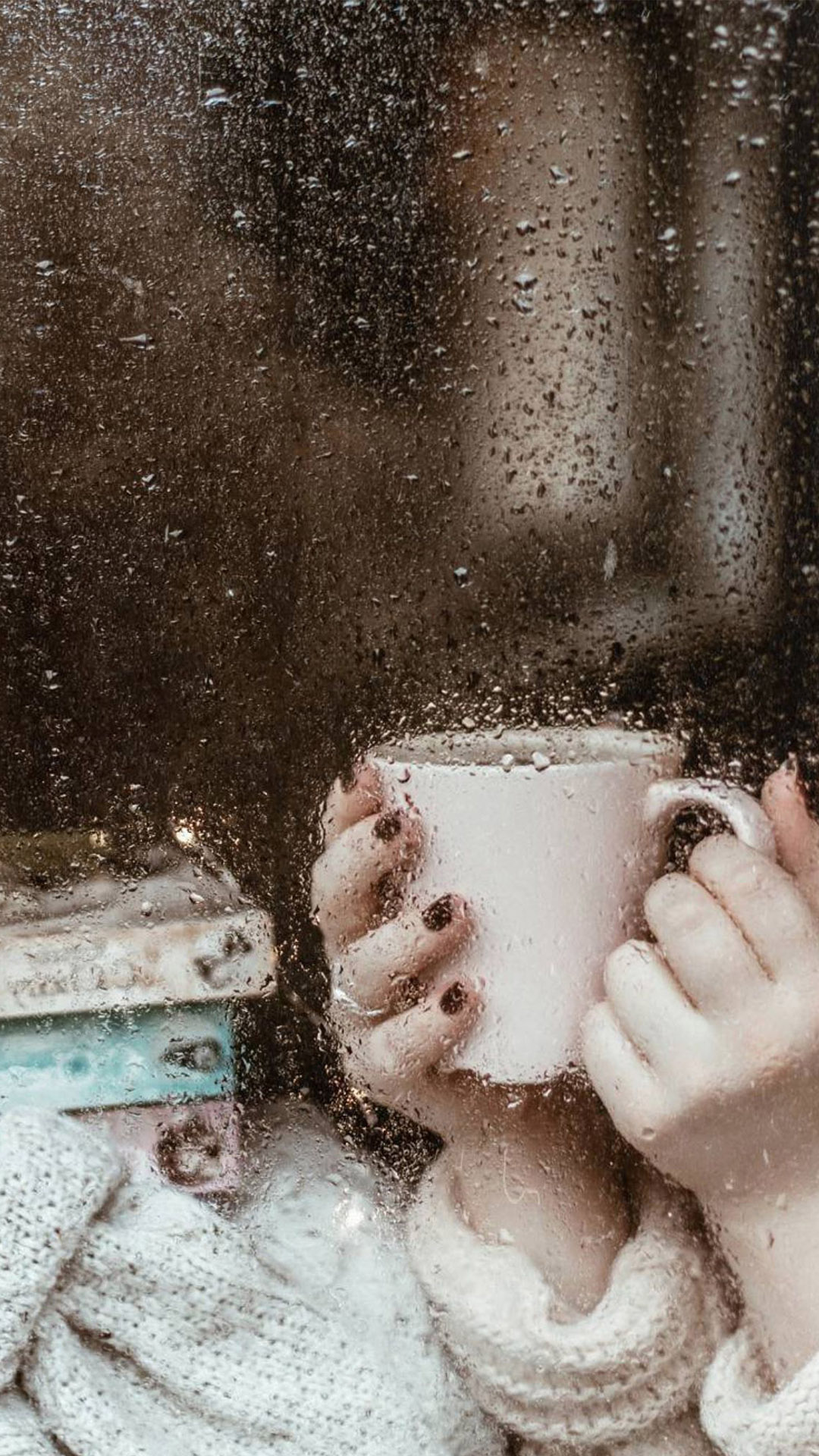 Na dworze pada, a ona siedzi w domu i pije gorącą herbatę