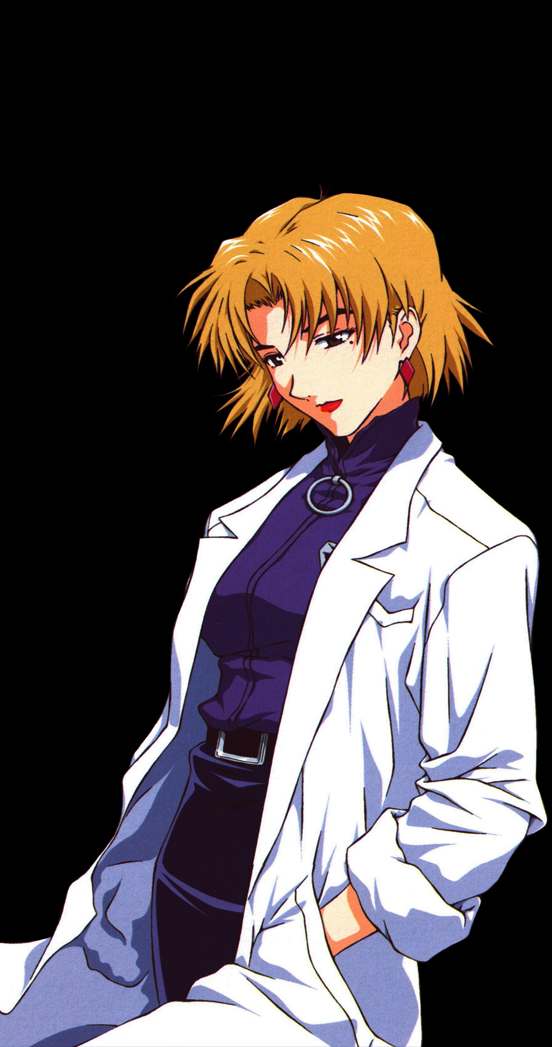Akagi Ritsuko jak zawsze w białym płaszczu, ale na czarnym tle. Spogląda w dół z namysłem