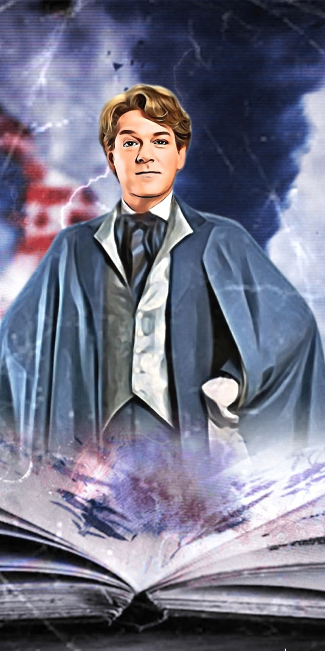 Albus Dumbledore z magicznym ogniem na czarnym tle
