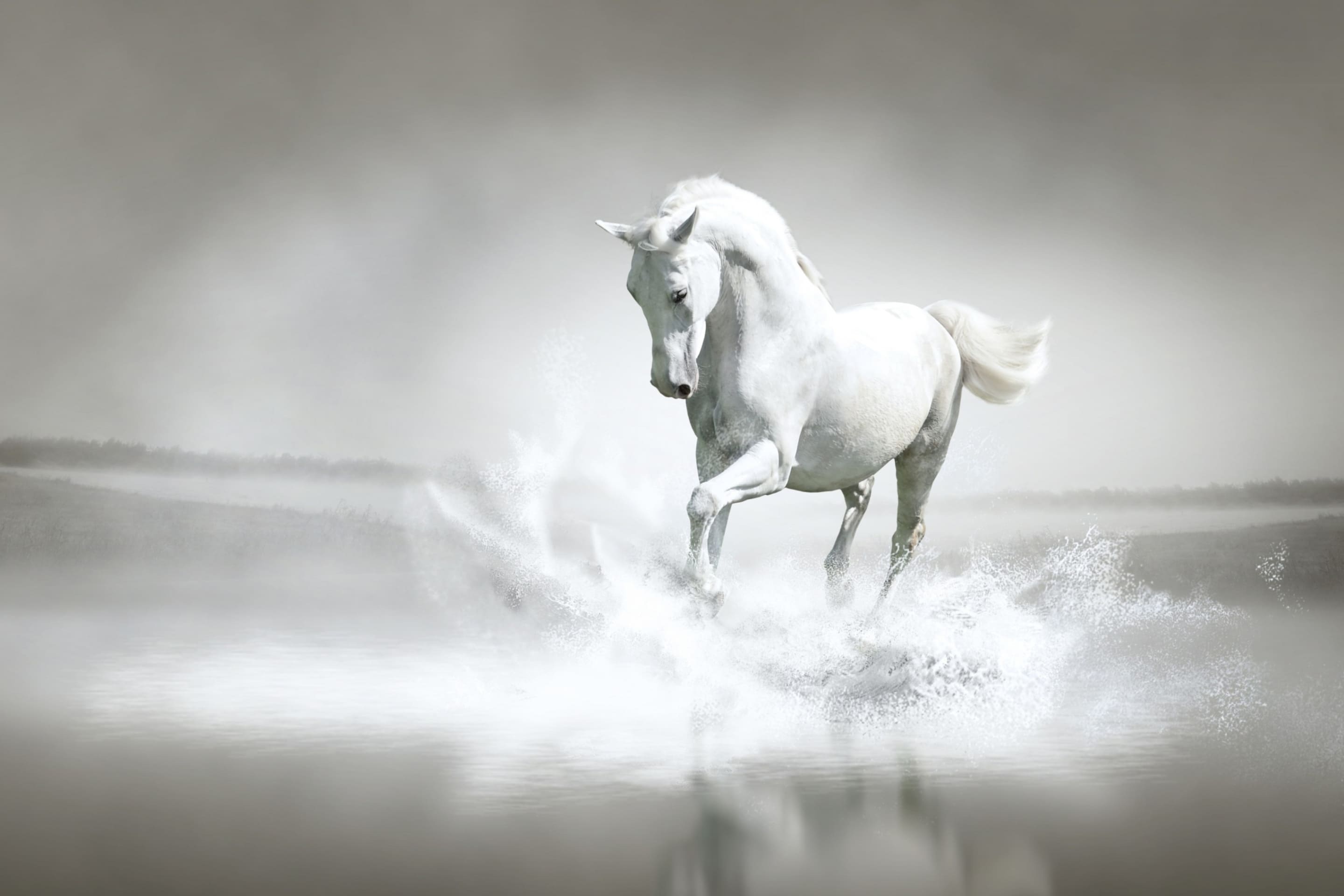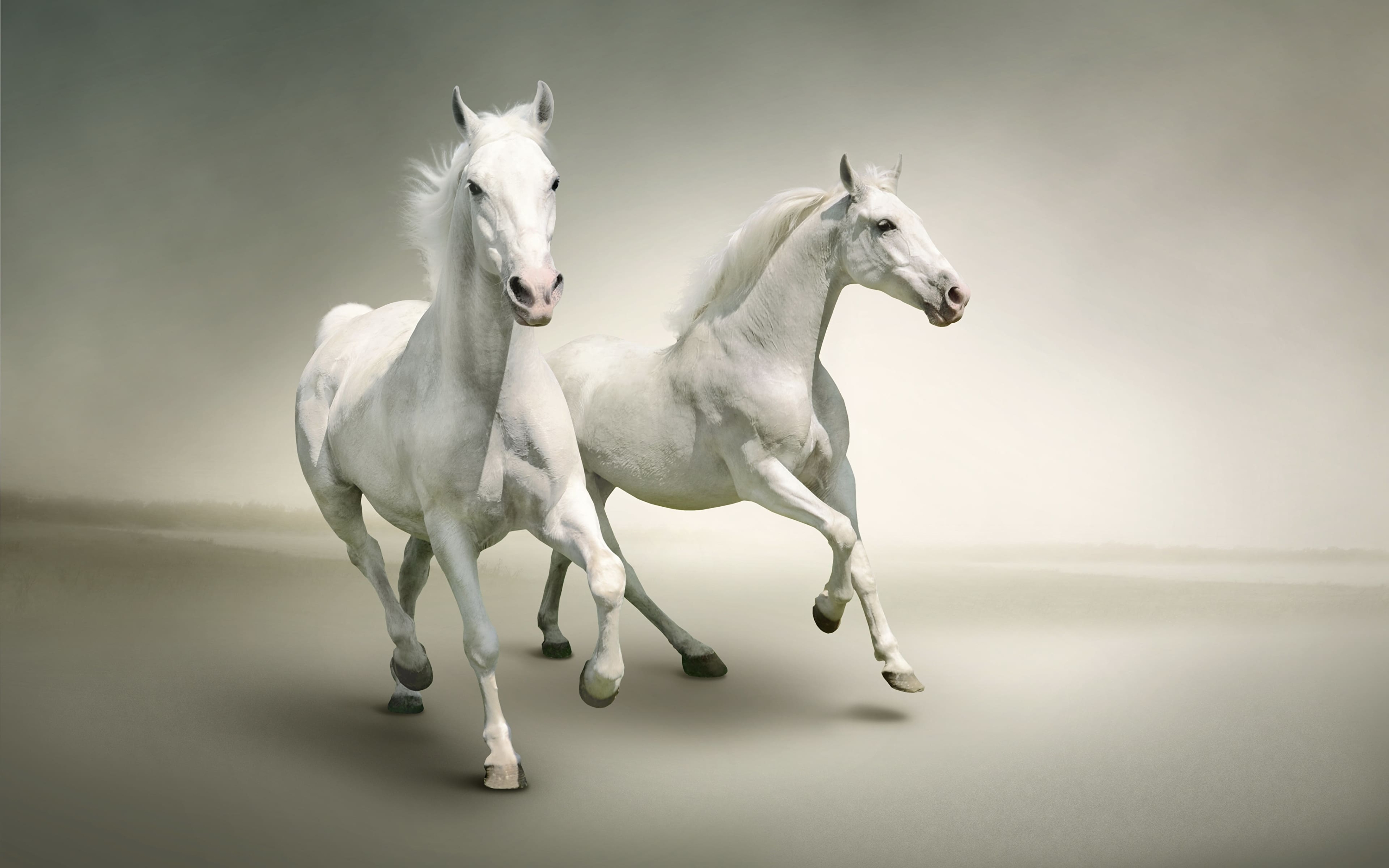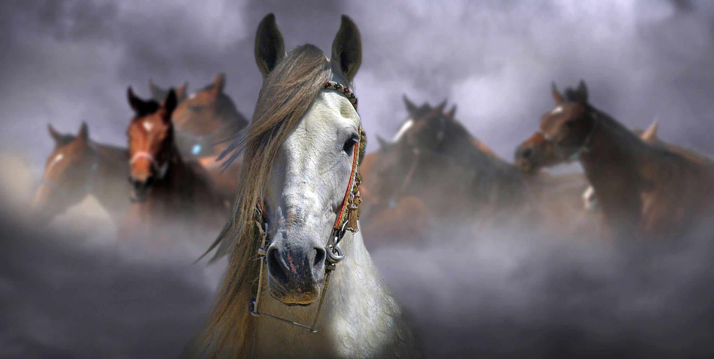Три белых коня несутся на бешеной скорости на фоне хмурого неба