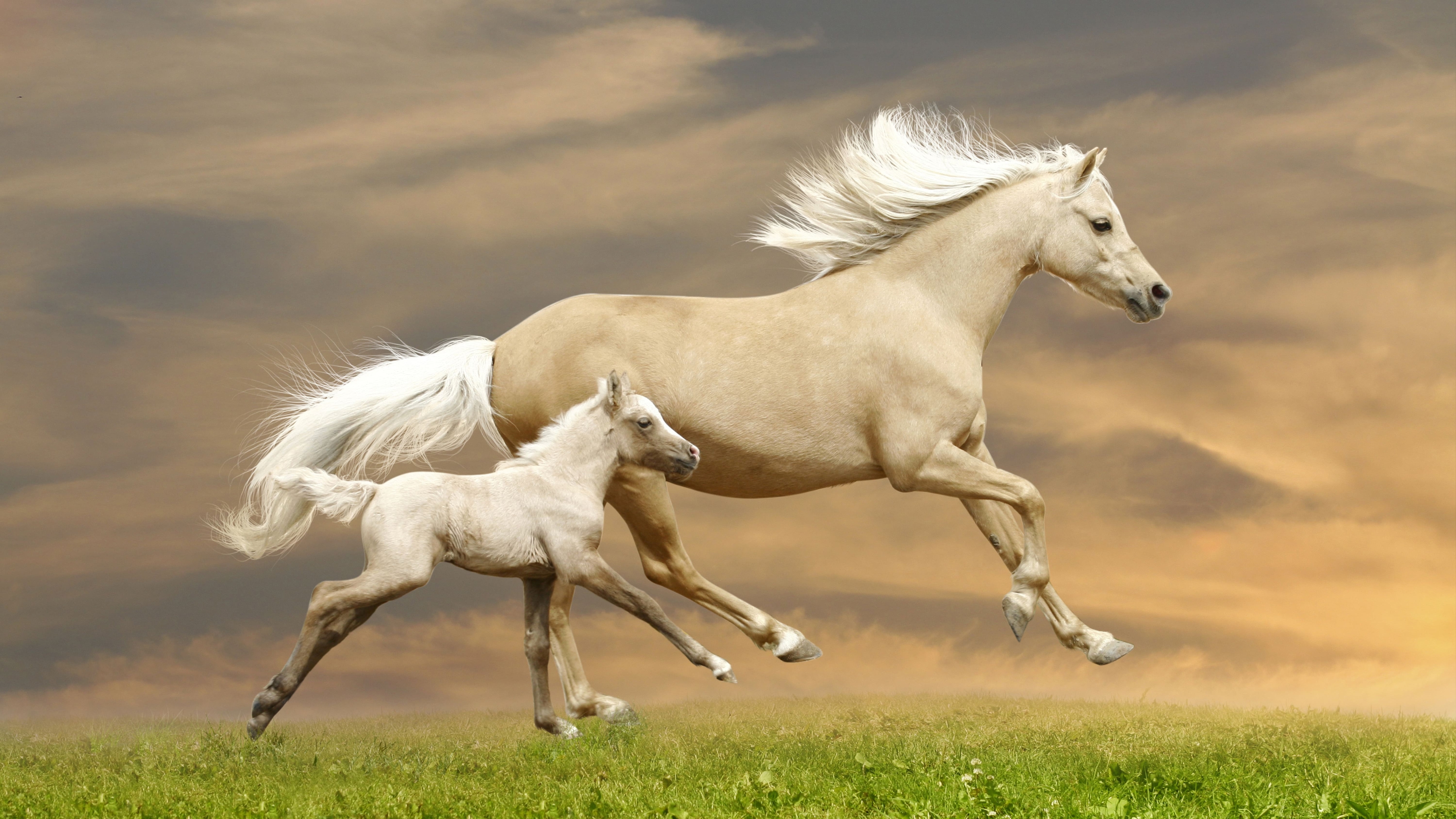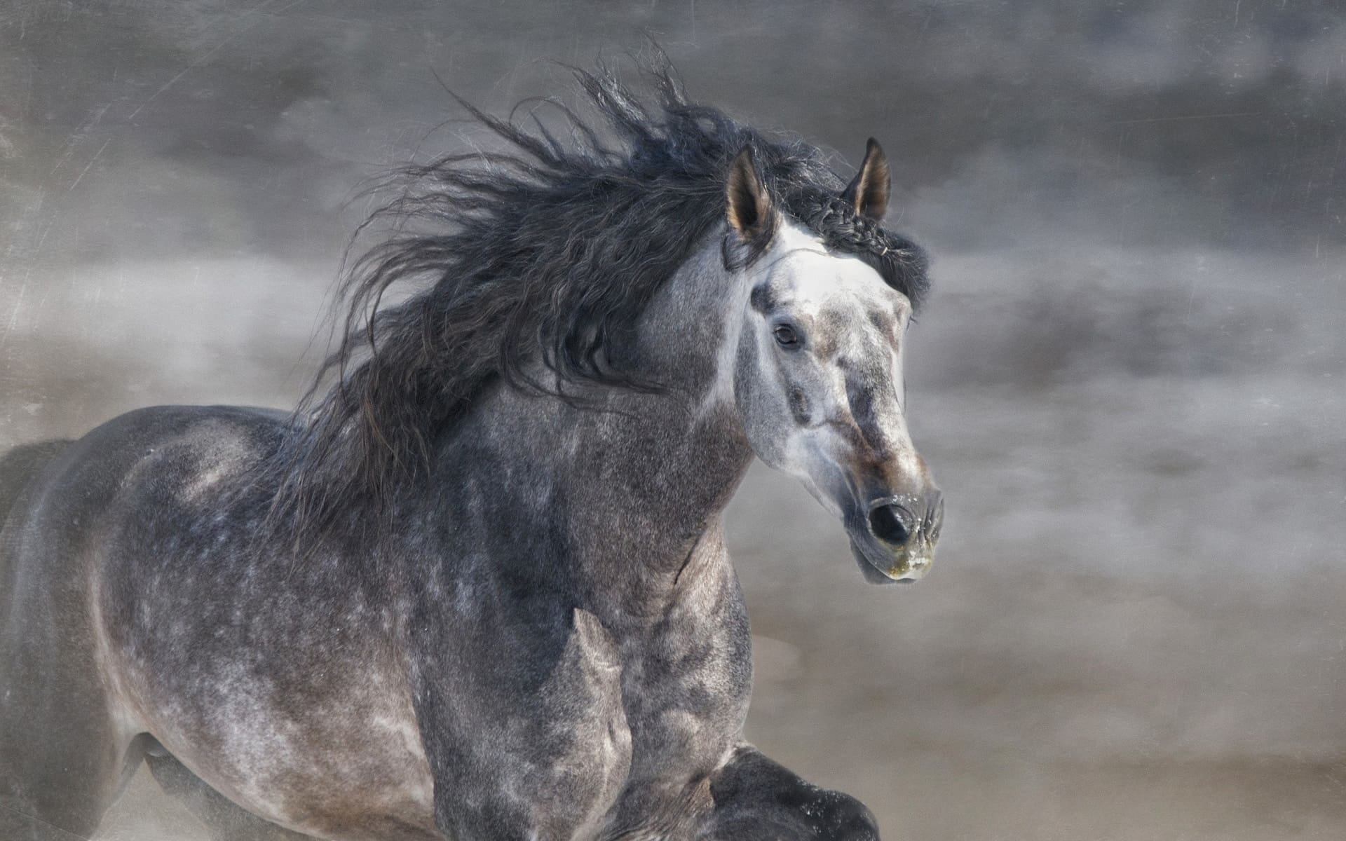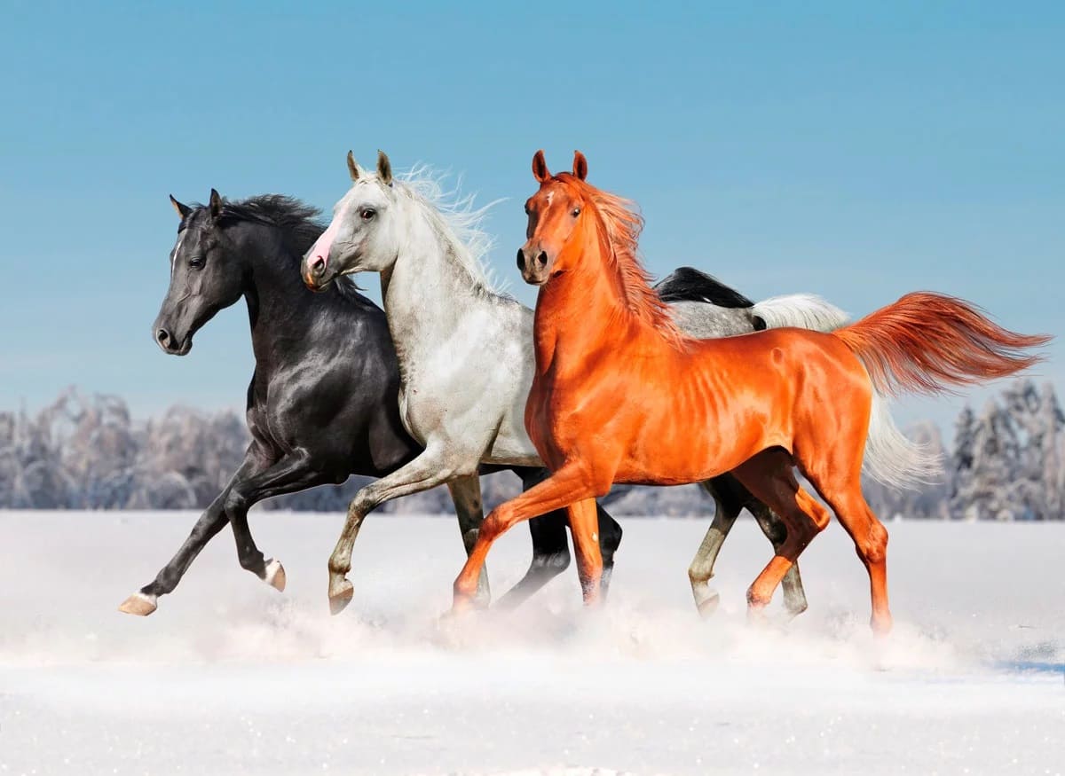 Три белых коня несутся на бешеной скорости на фоне хмурого неба