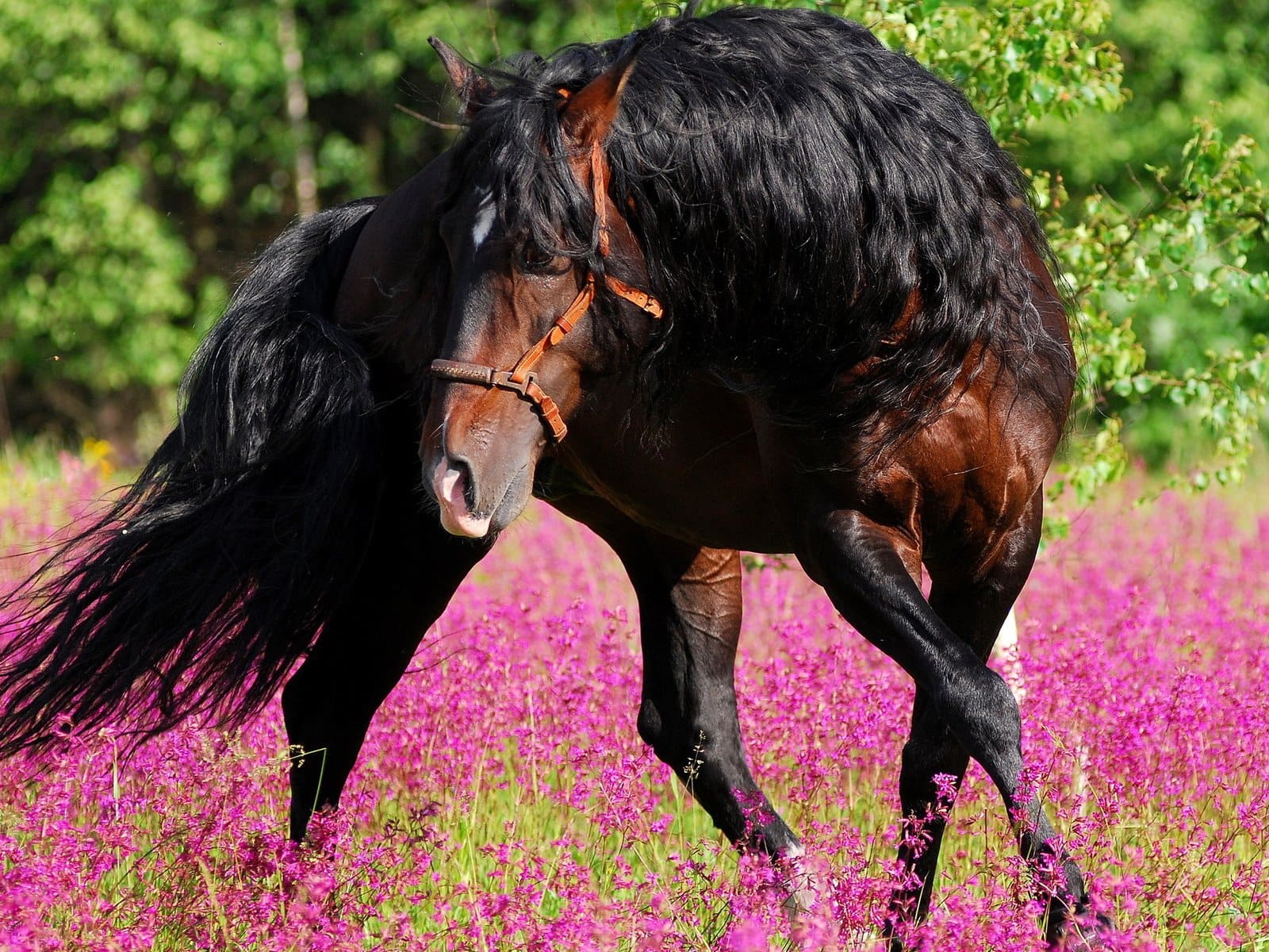 Мускулистая коричневая лошадь с черной гривой пасется в поле с фиолетовыми цветами