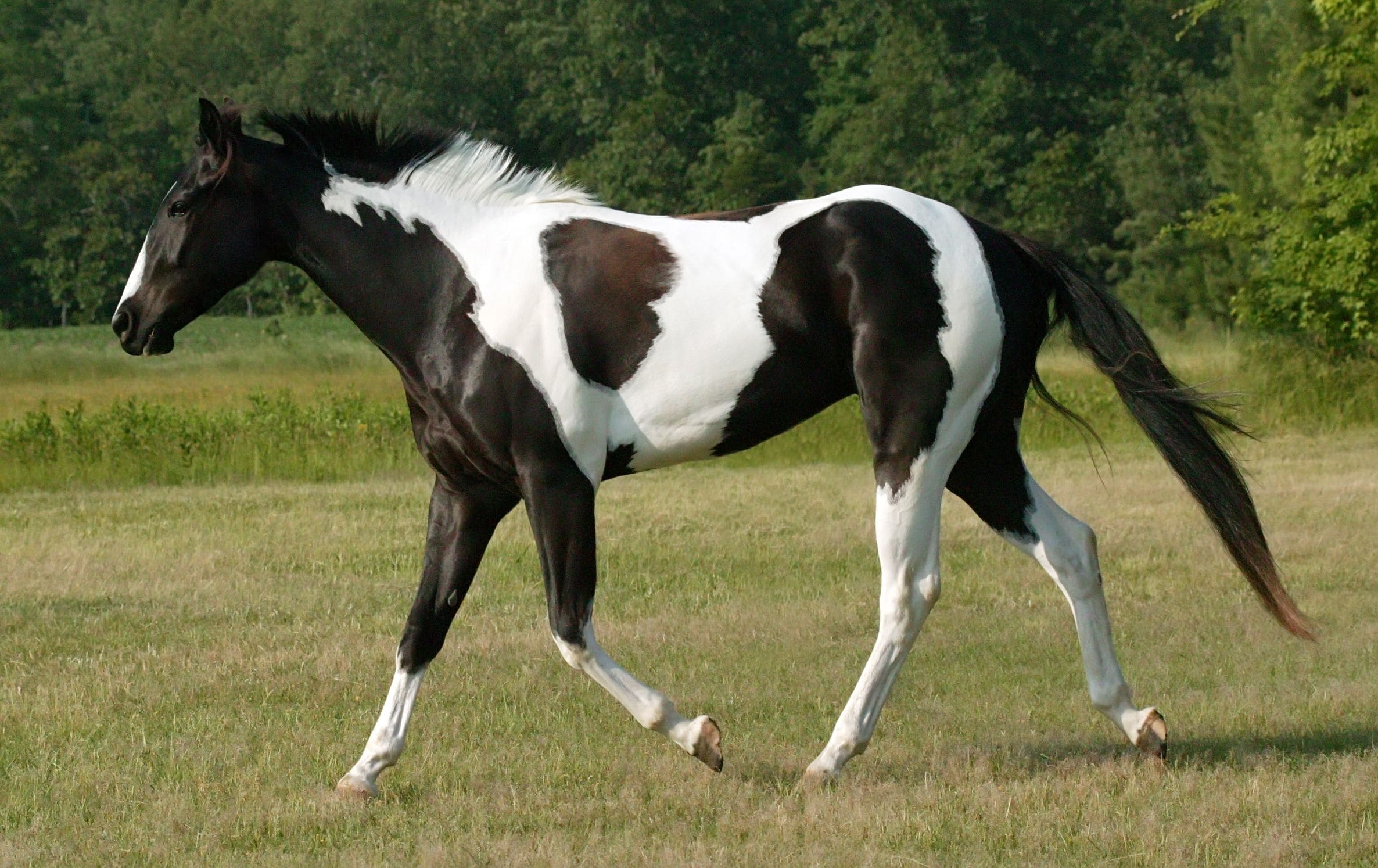 Породистая лошадь редкого черно-белого окраса гуляет по полю на фоне зеленого леса