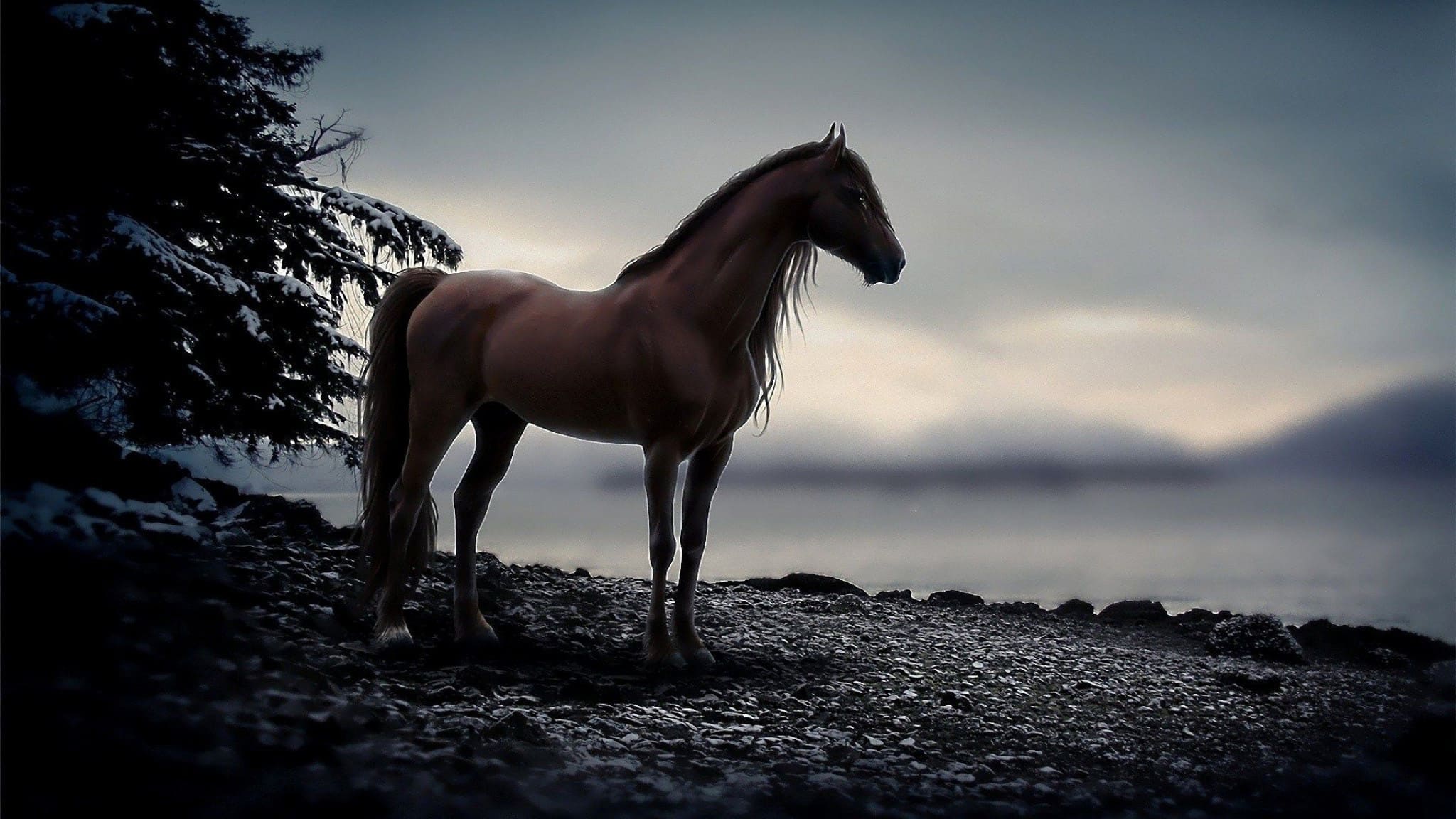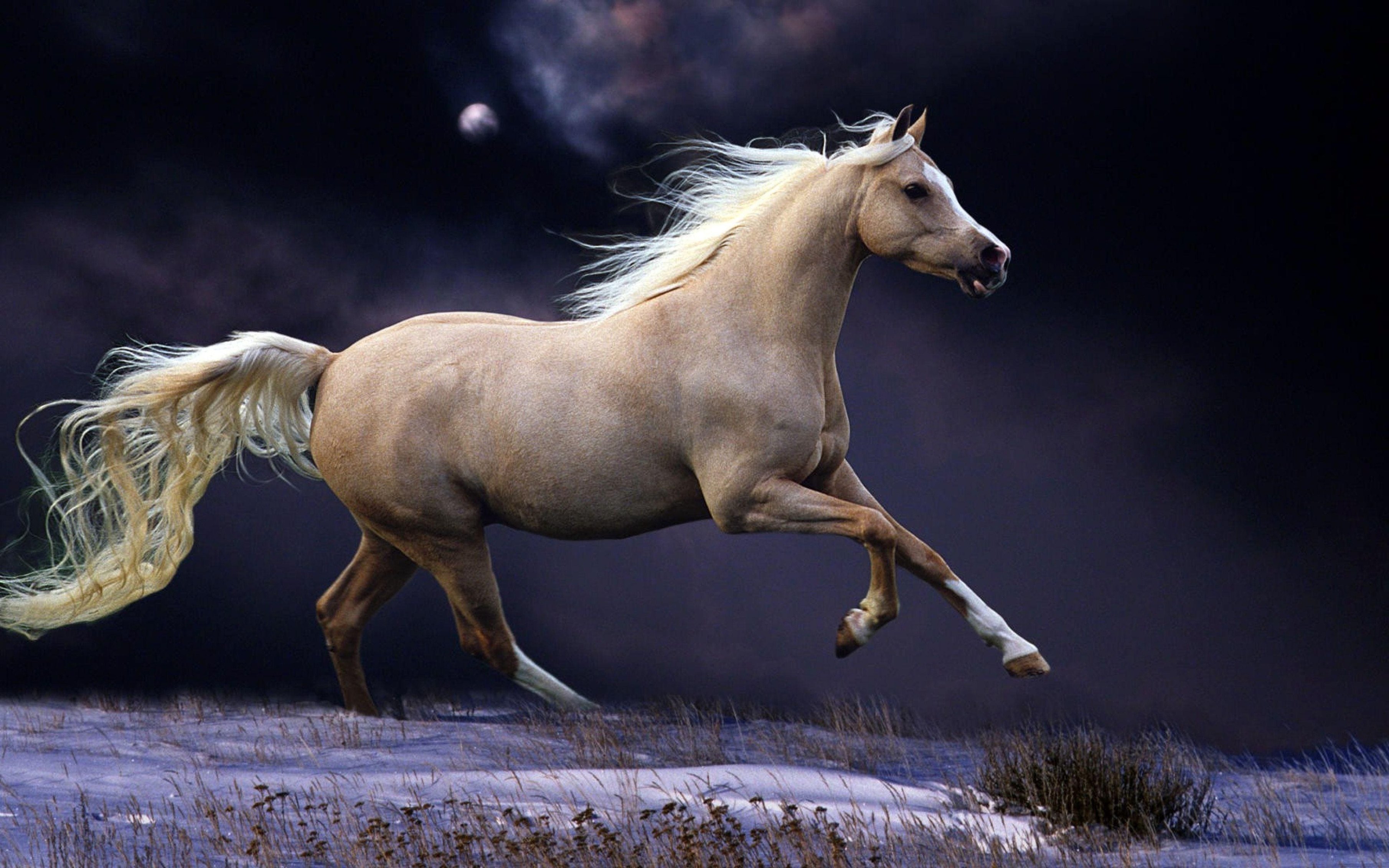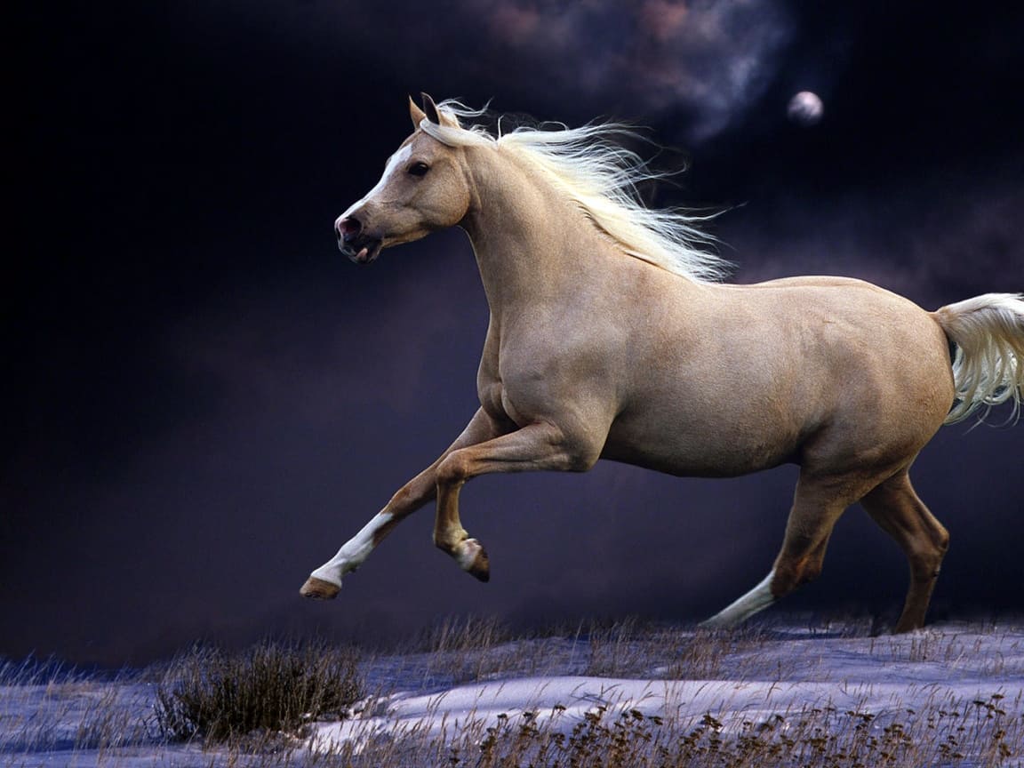 Грациозная лошадь скачет по заснеженному полю на фоне облачного неба ночью