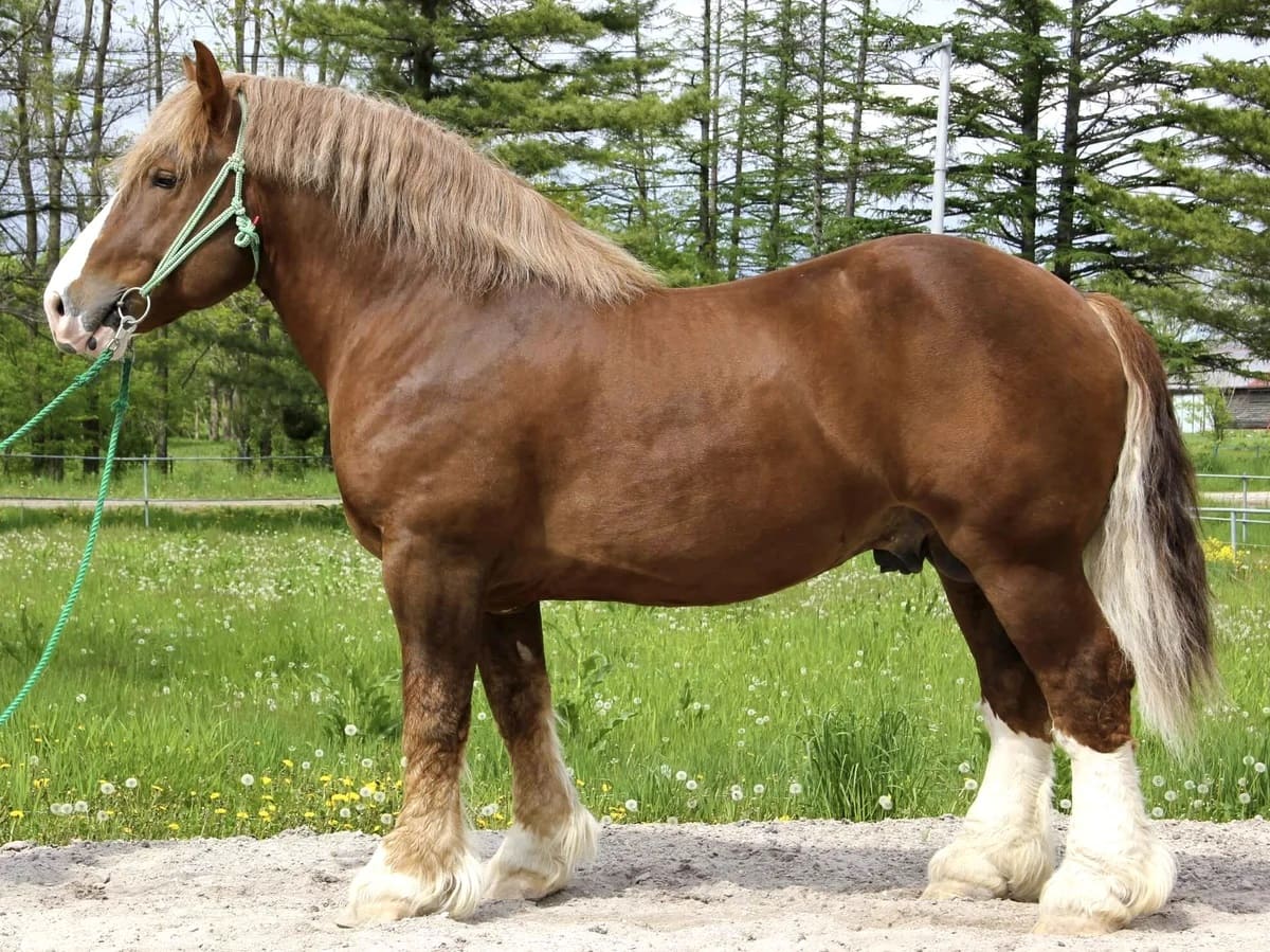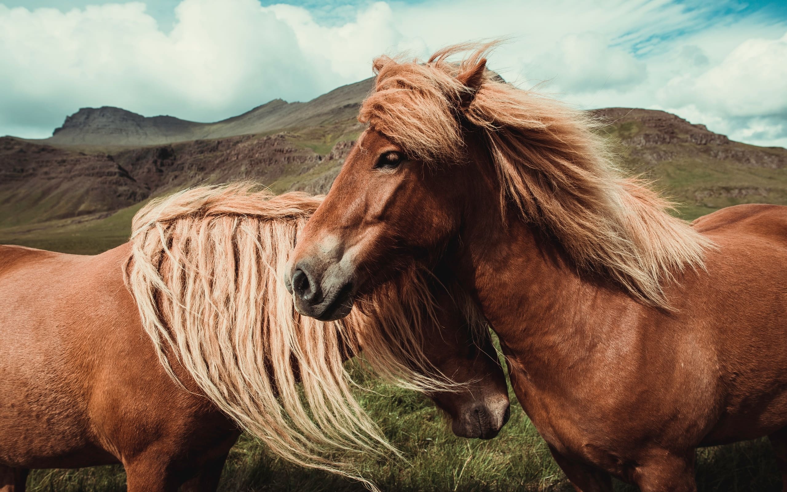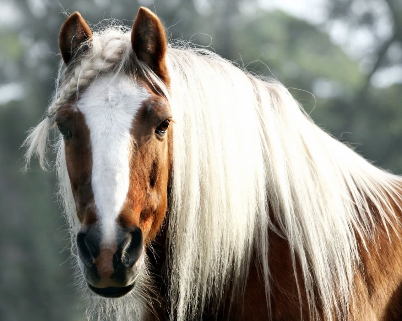Коричневая лошадь с пышной светлой гривой, закрывающей морду