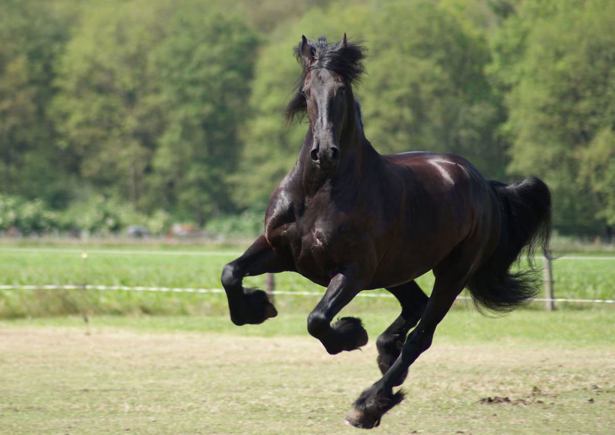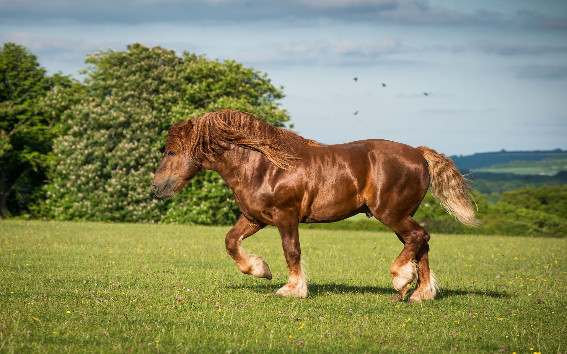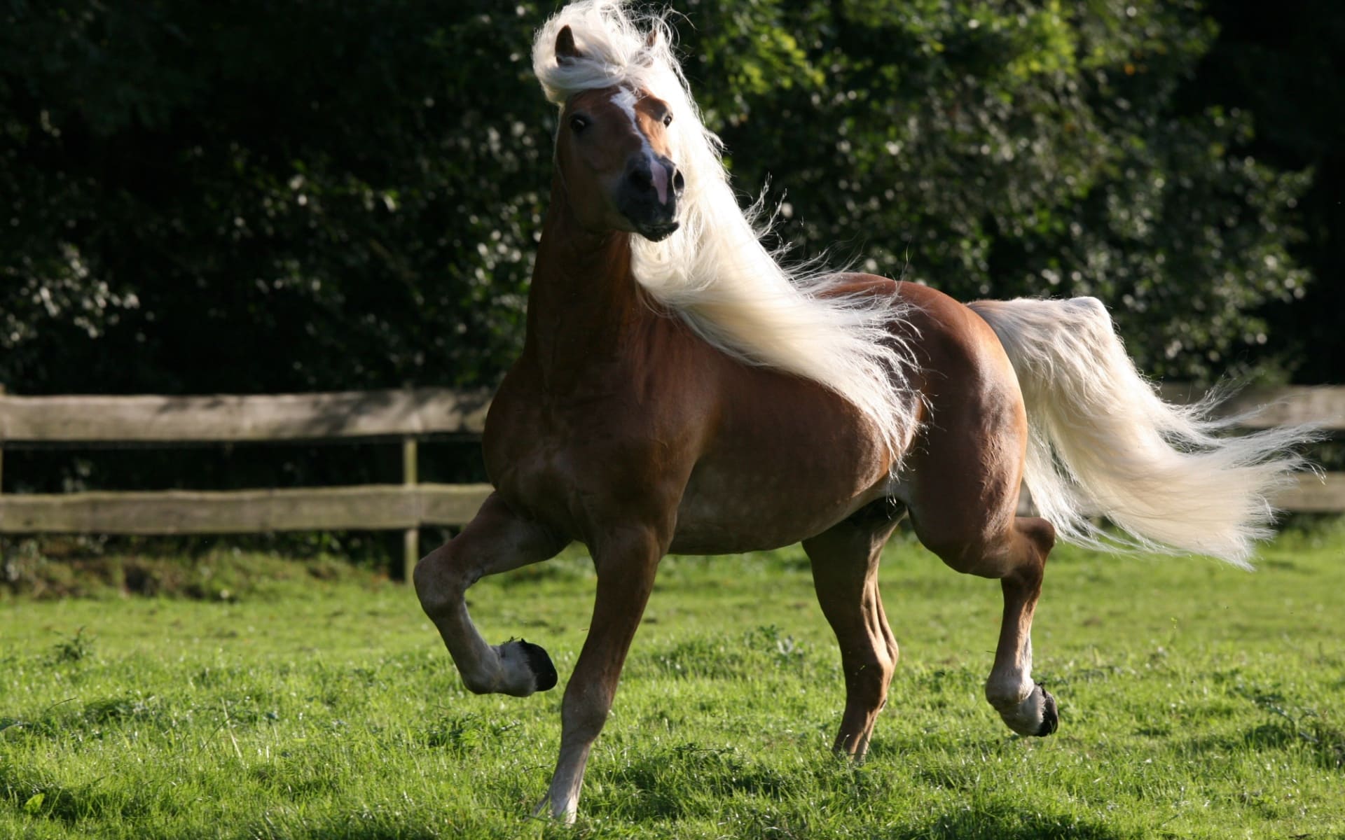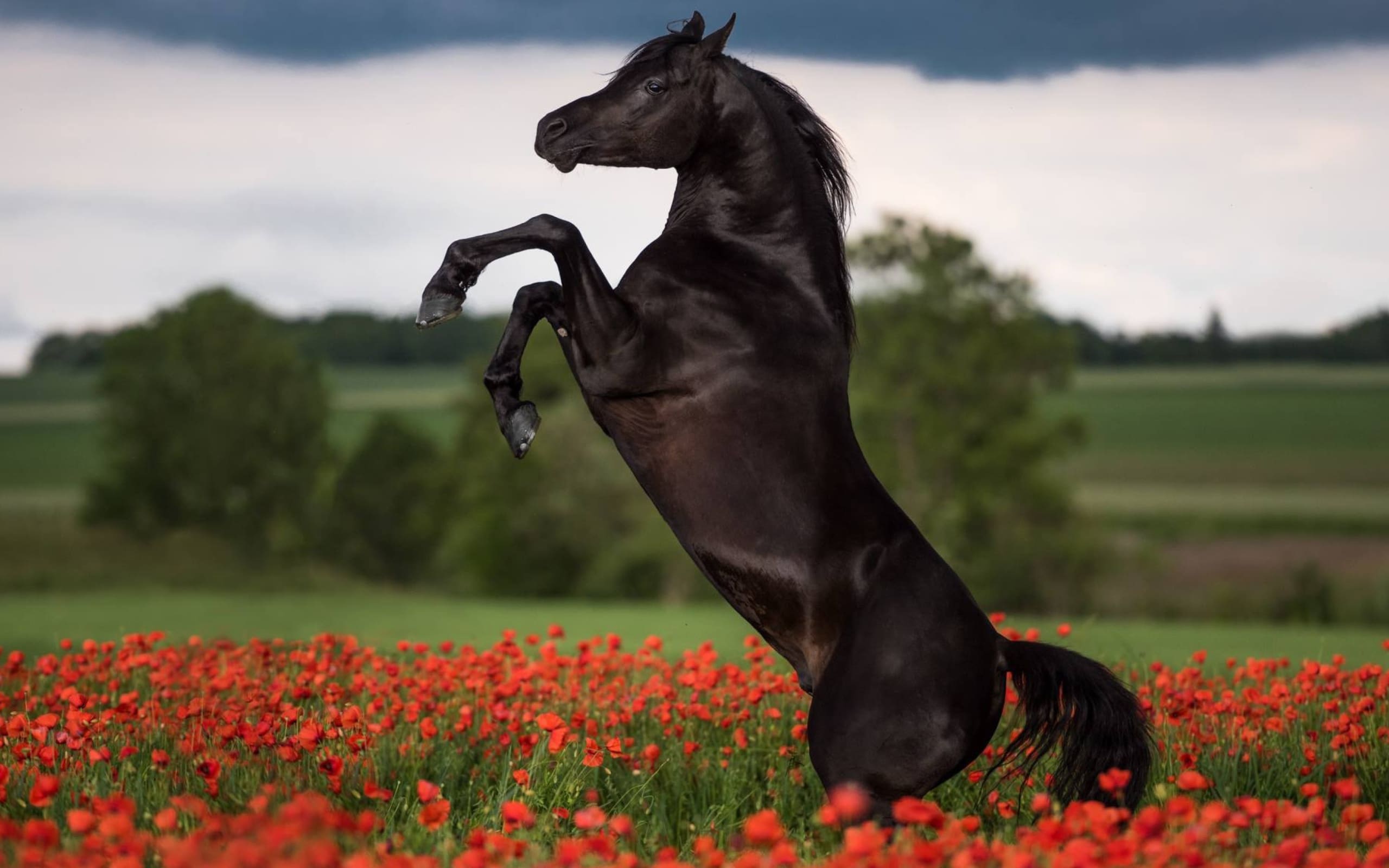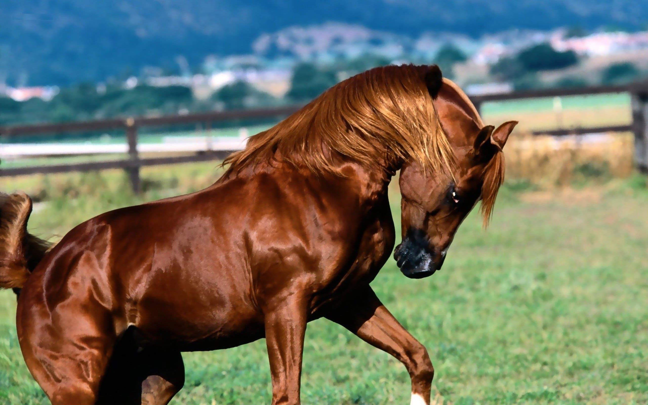 Великолепный конь с блестящей шерстью резвится на фоне природы