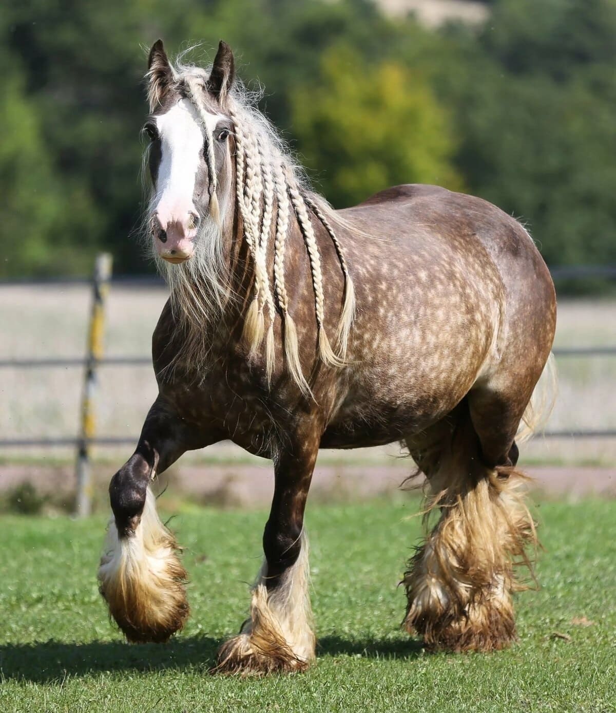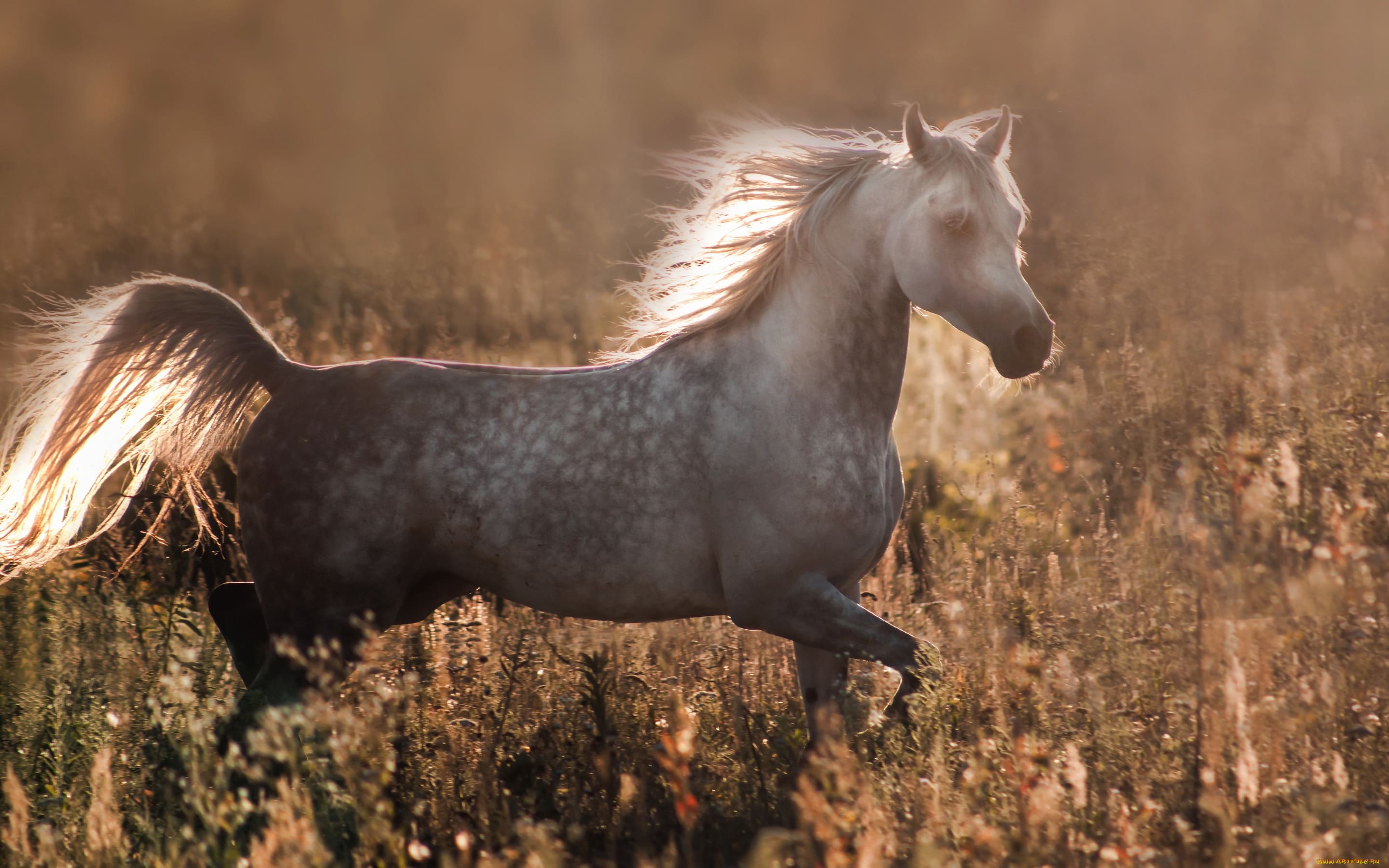 Серая лошадь с белыми пятнами идет по полю, залитому солнечным светом