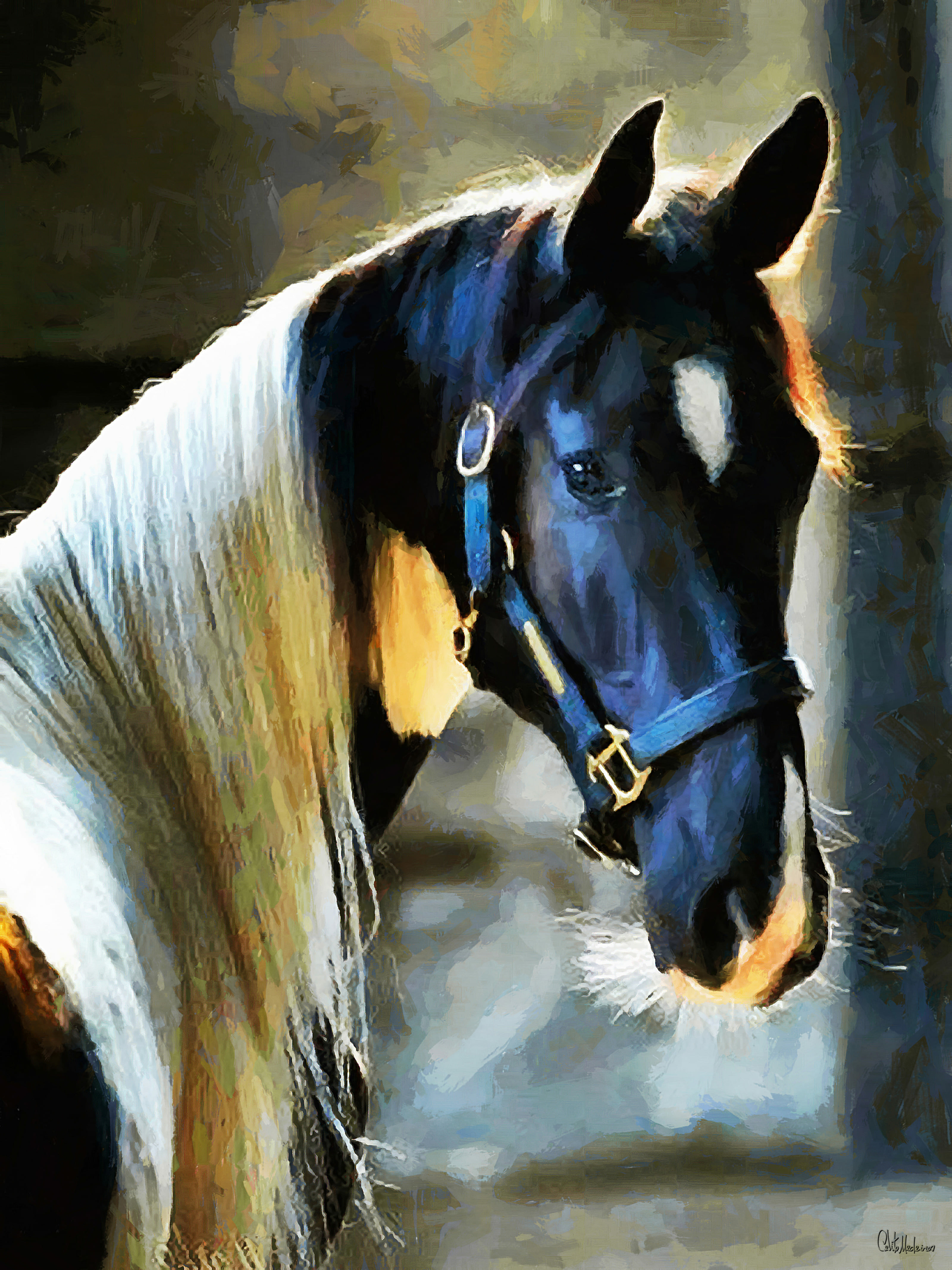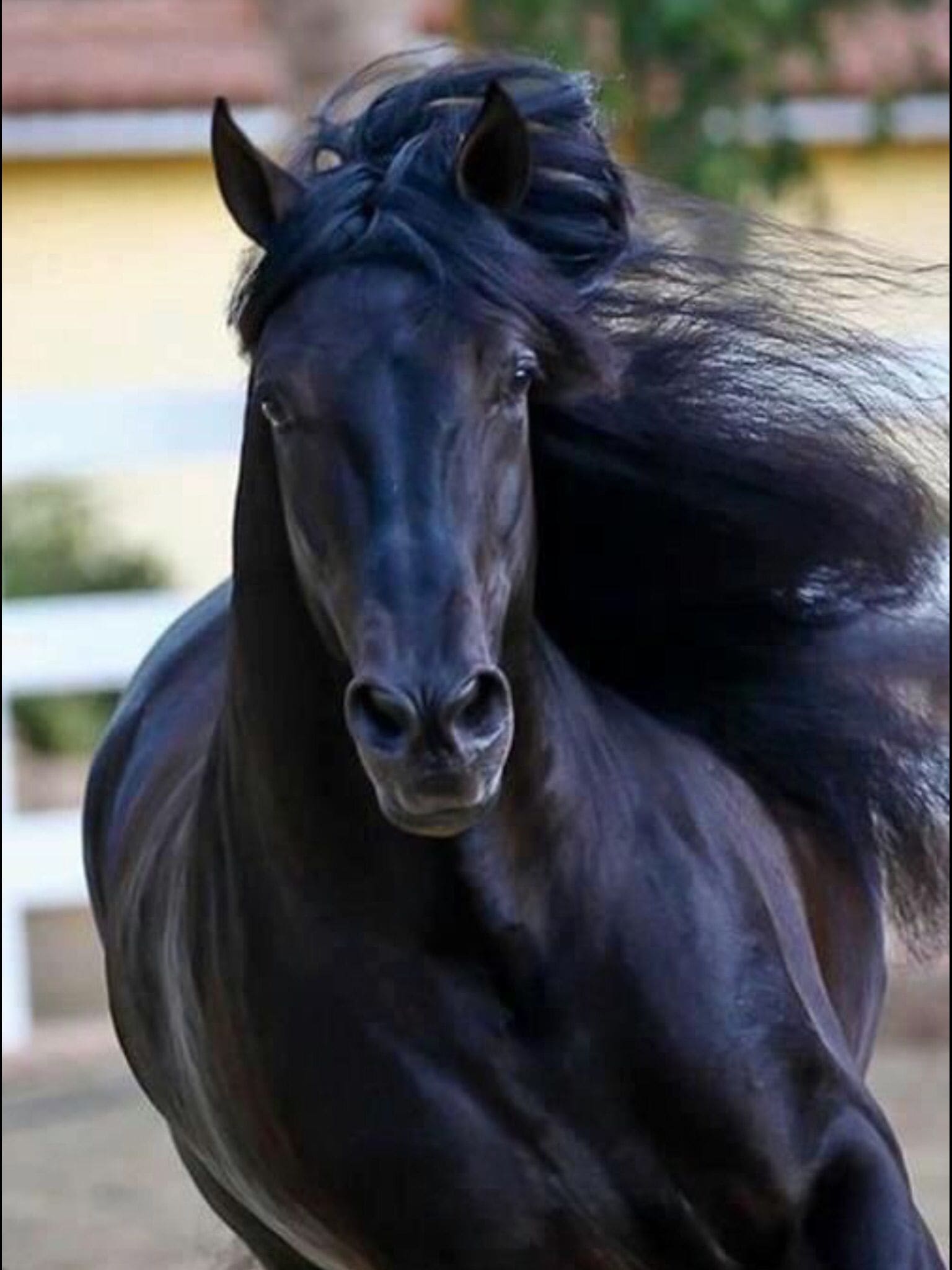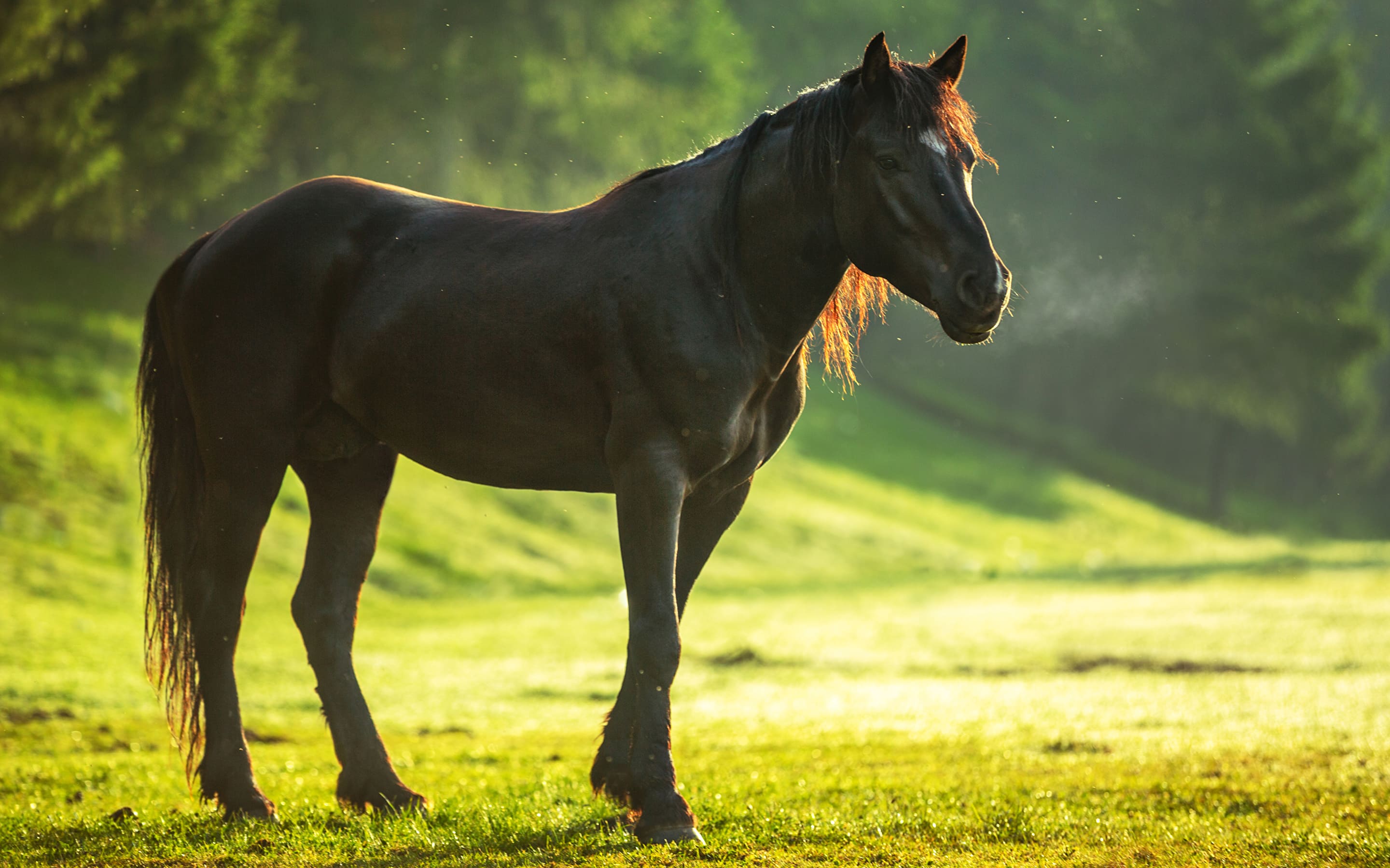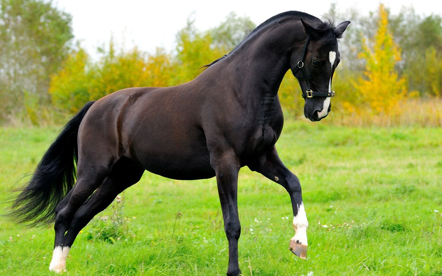 Черный конь с белым пятном на лбу стоит на лужайке, залитой солнечным светом
