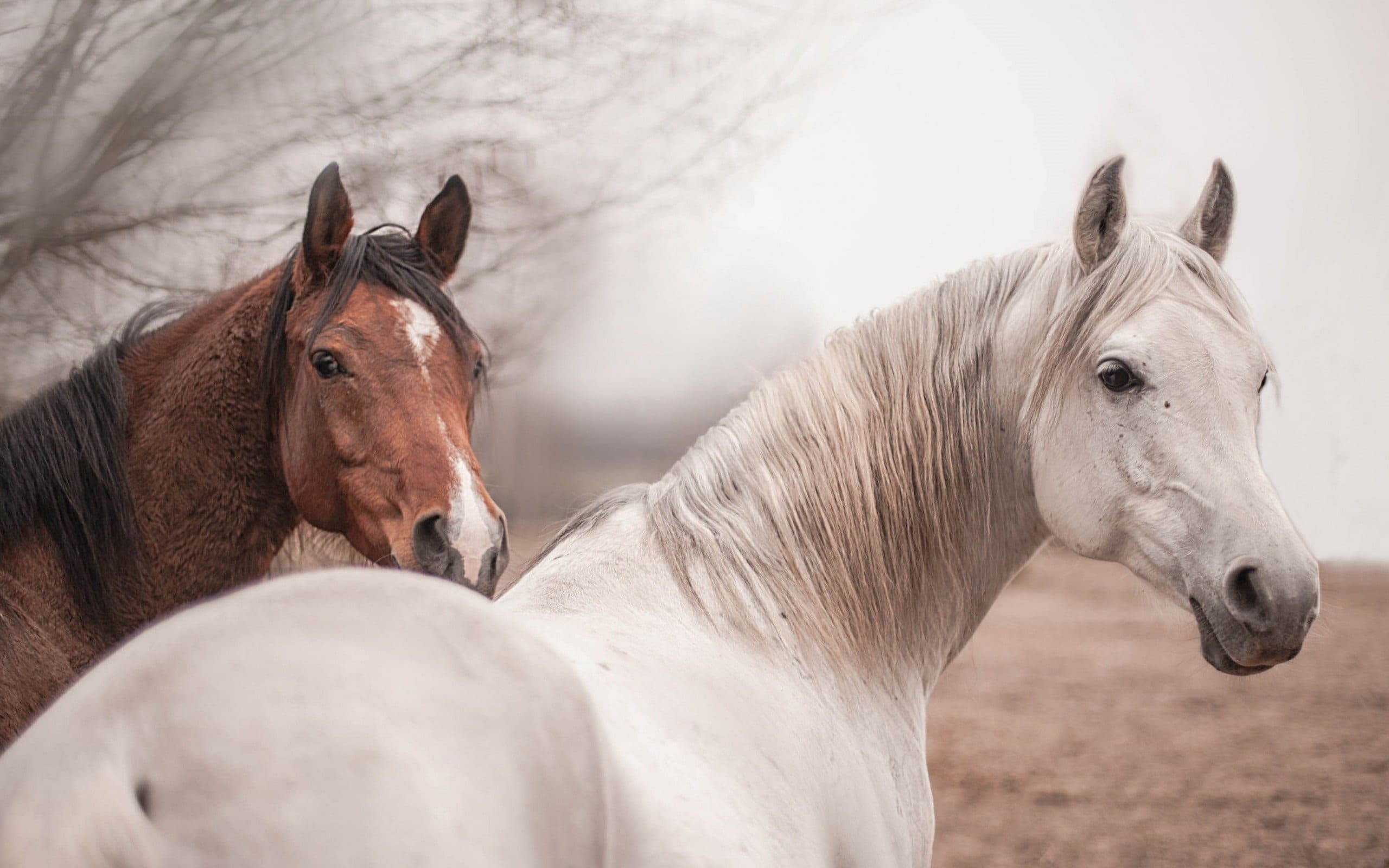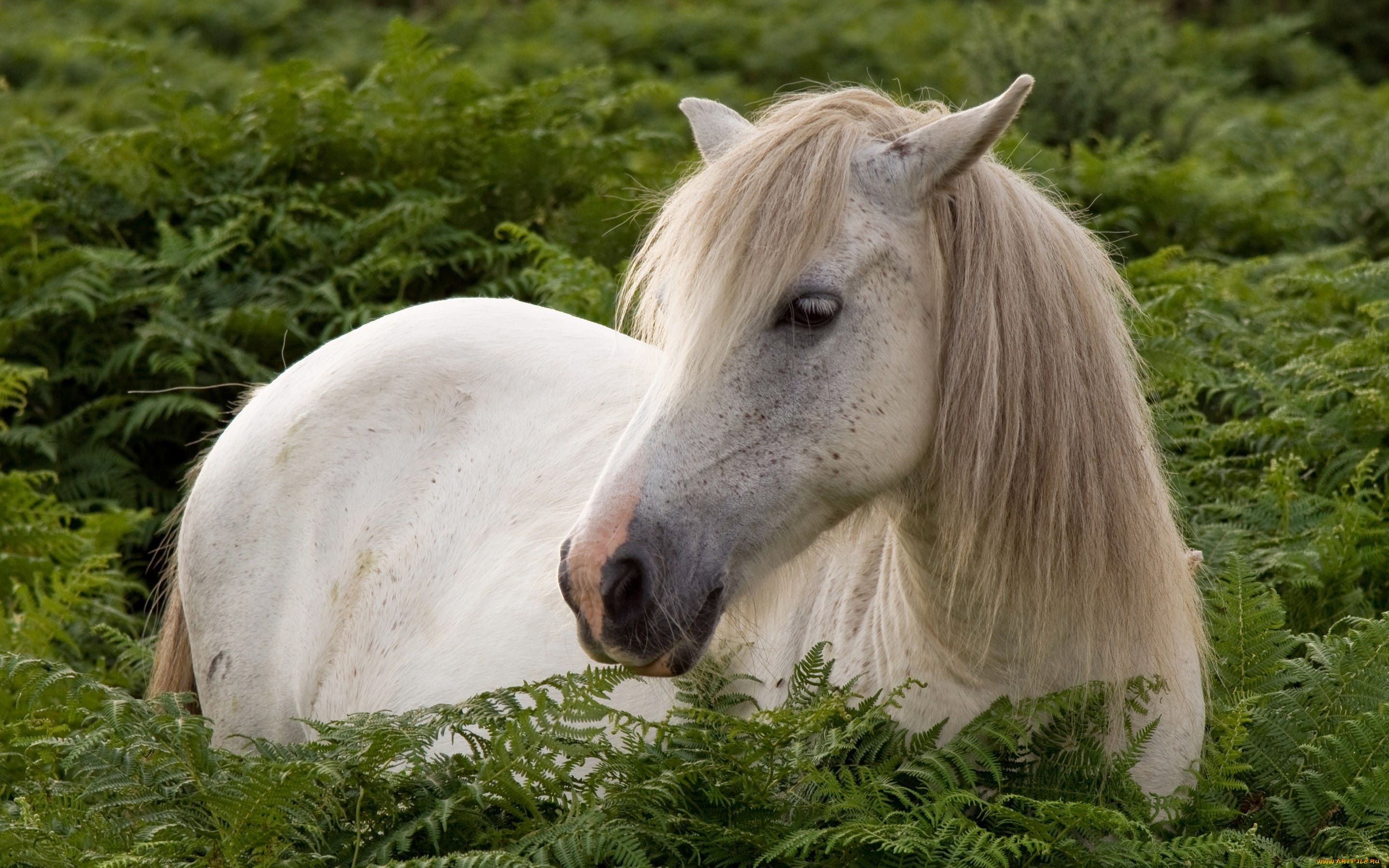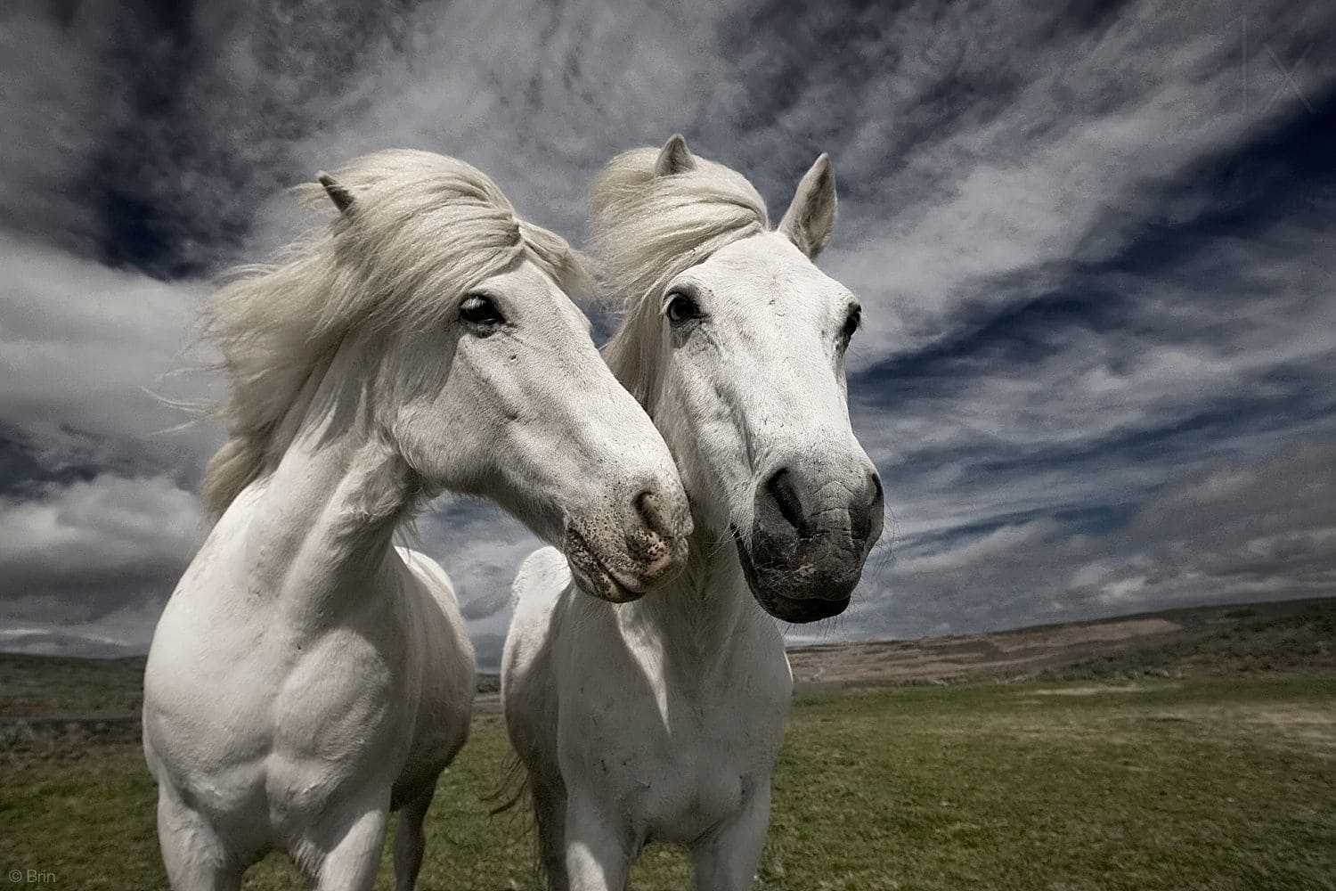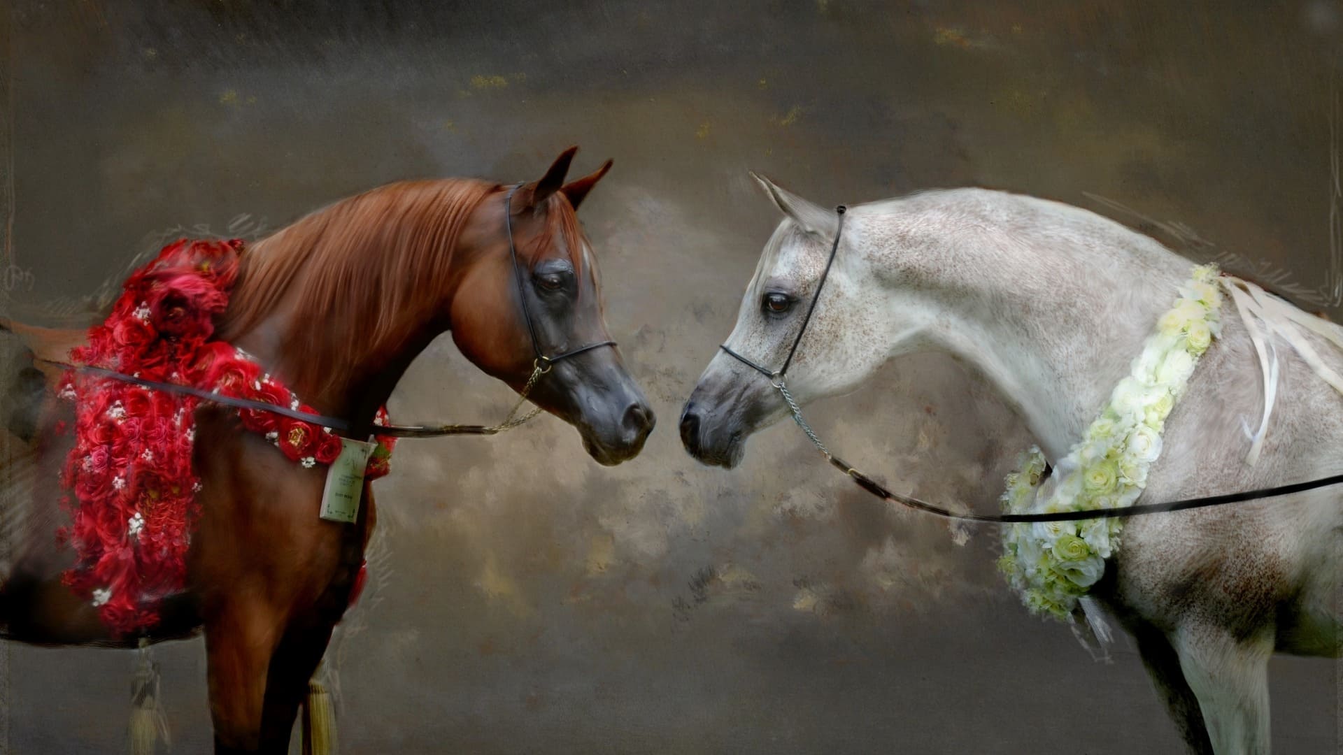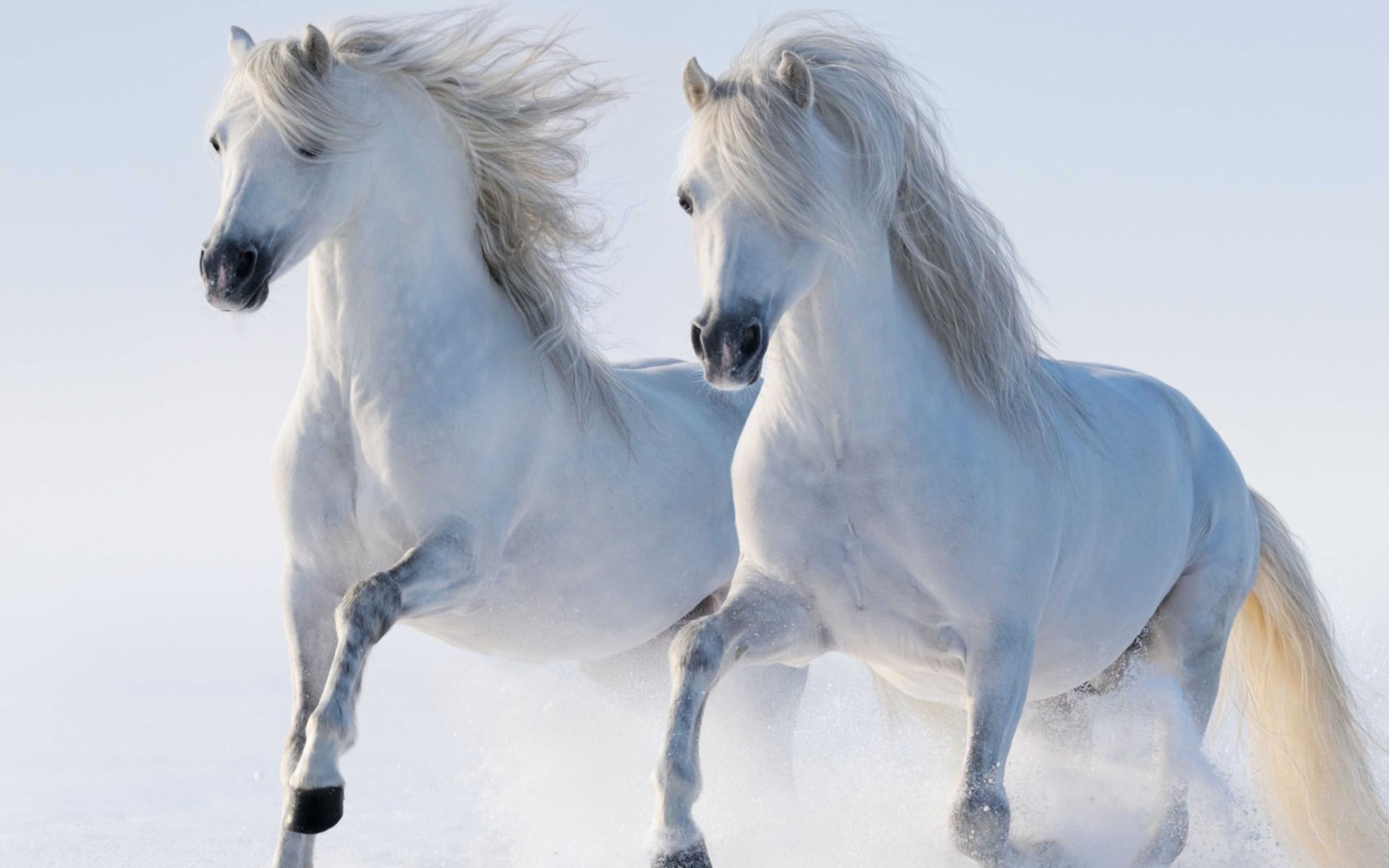 Пара белоснежных лошадей в окружении прекрасных цветов