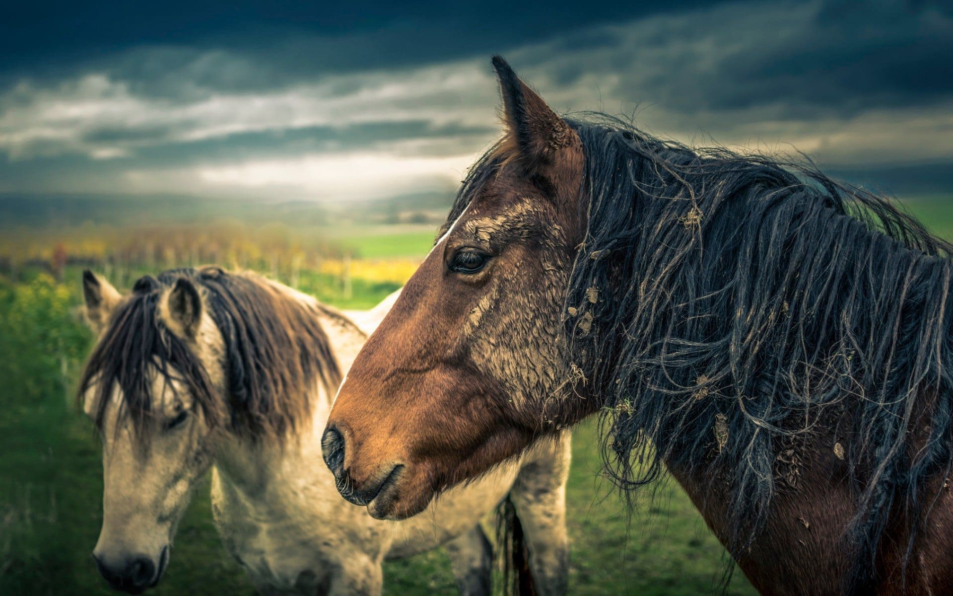 Несчастные дикие лошади стоят в поле на фоне облачного неба