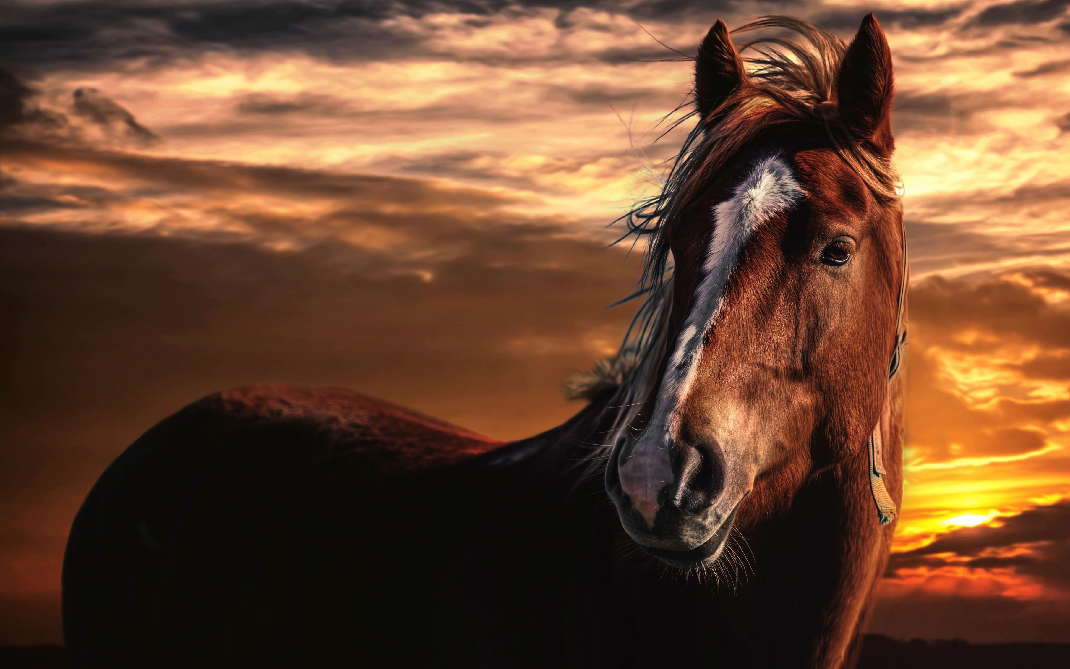 Красивый задумчивый конь стоит на фоне живописного закатного неба