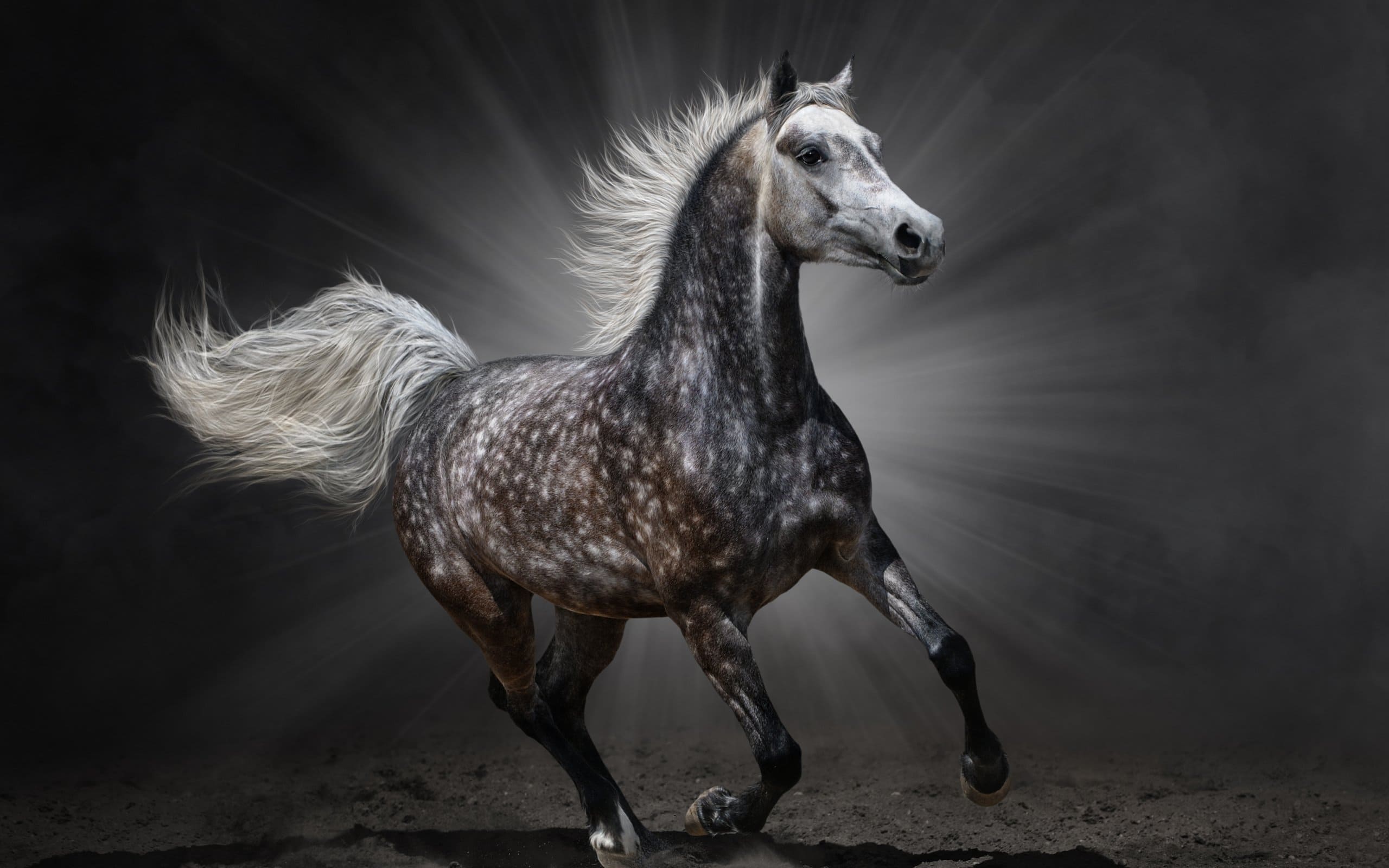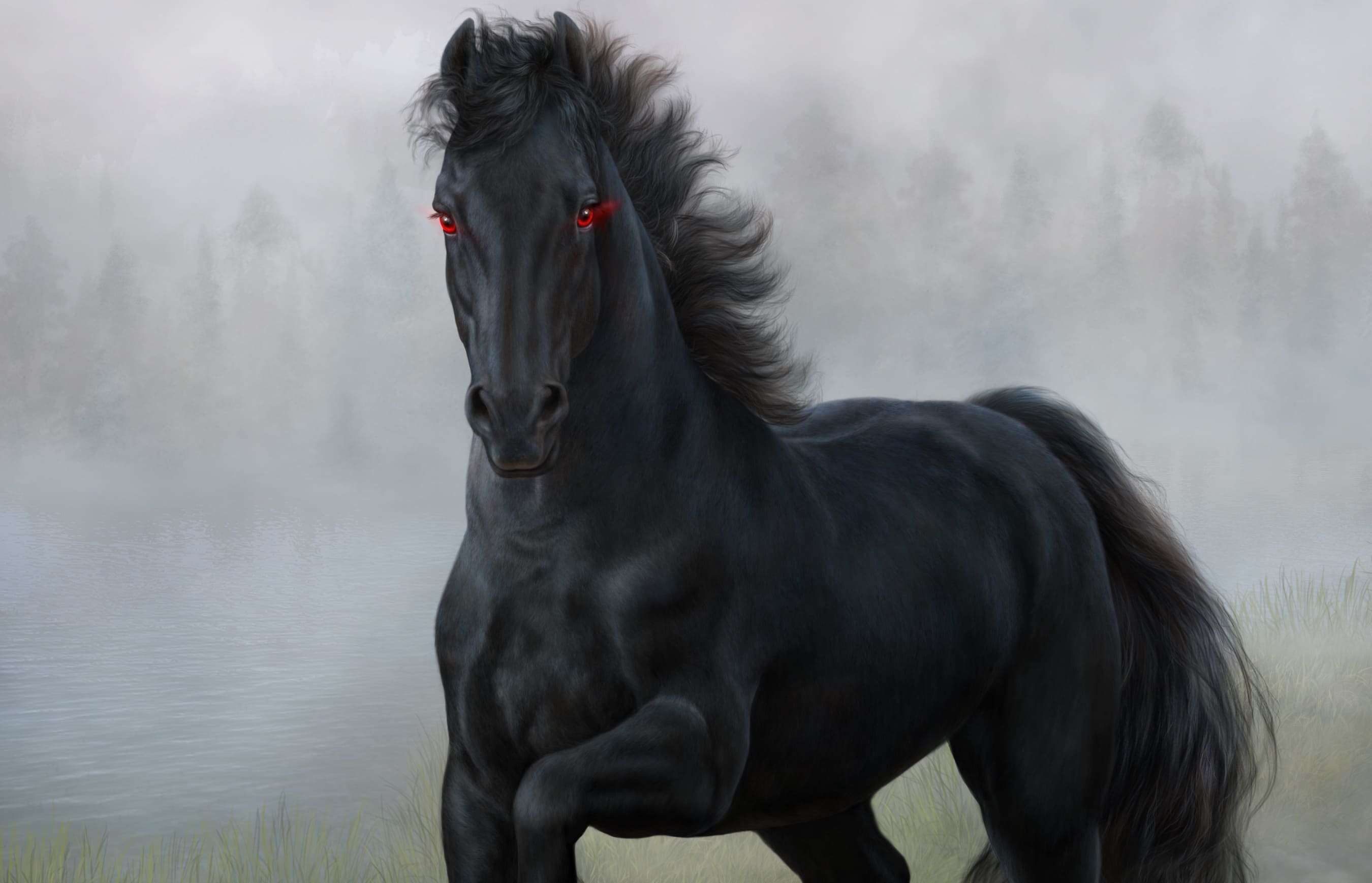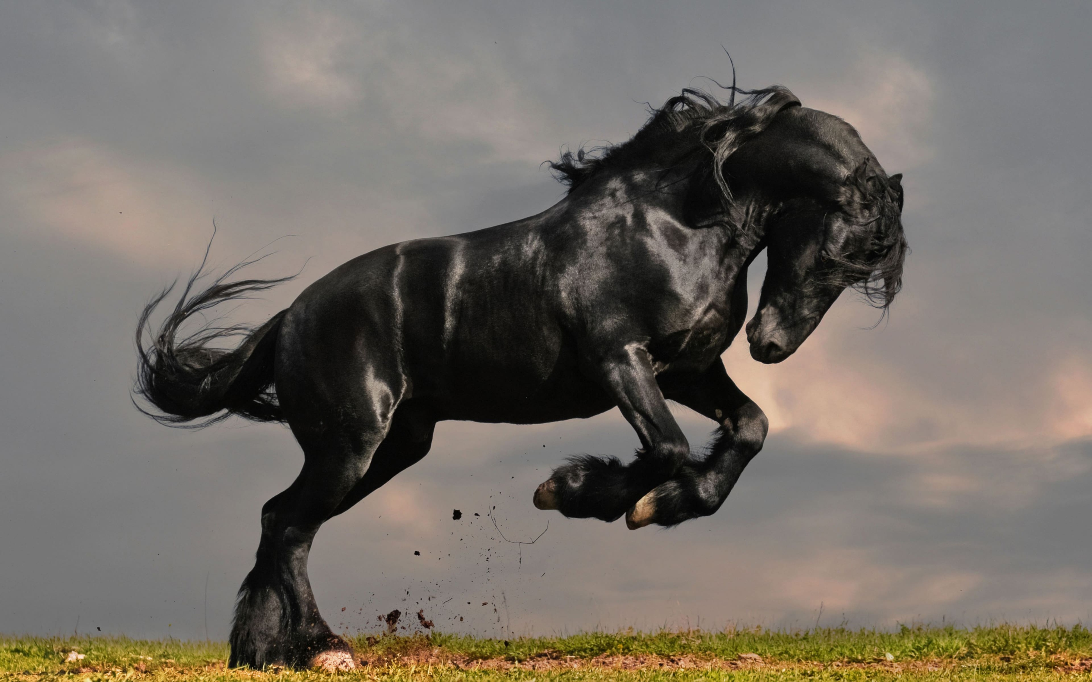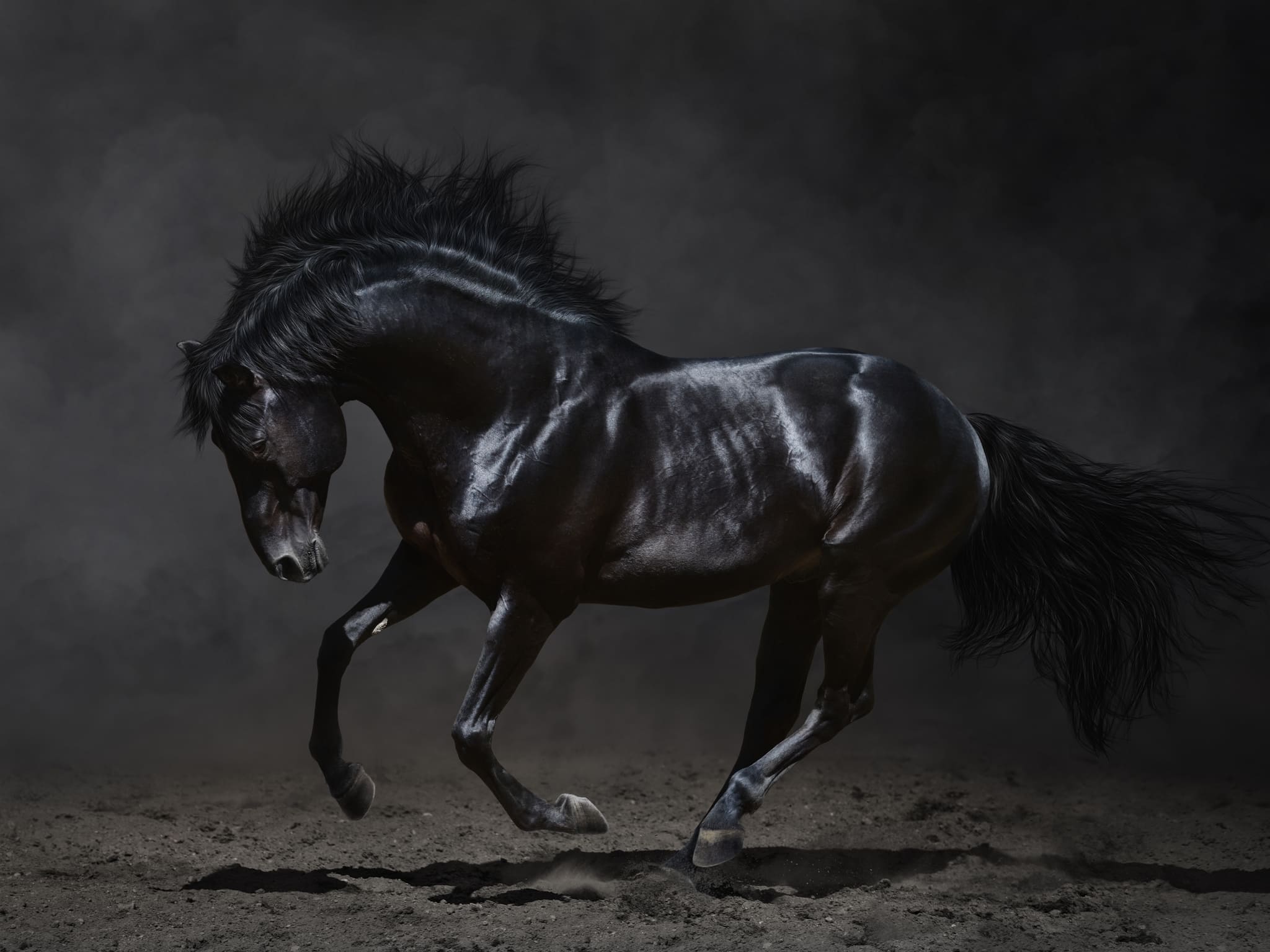 Великолепный вороной конь прыгает в призрачном свете на темном фоне